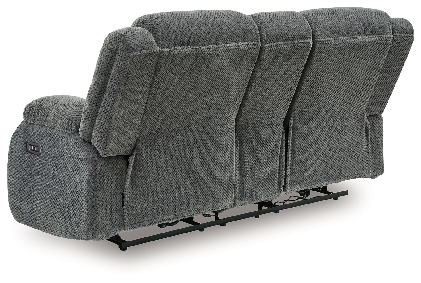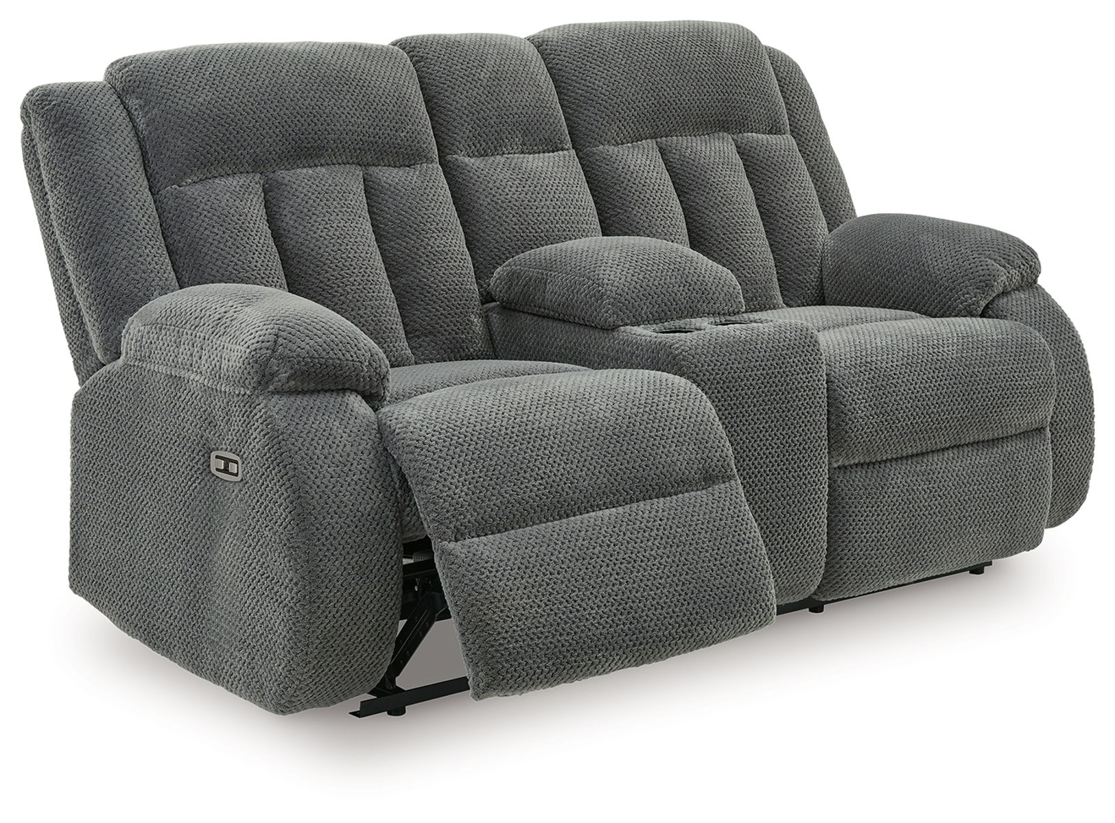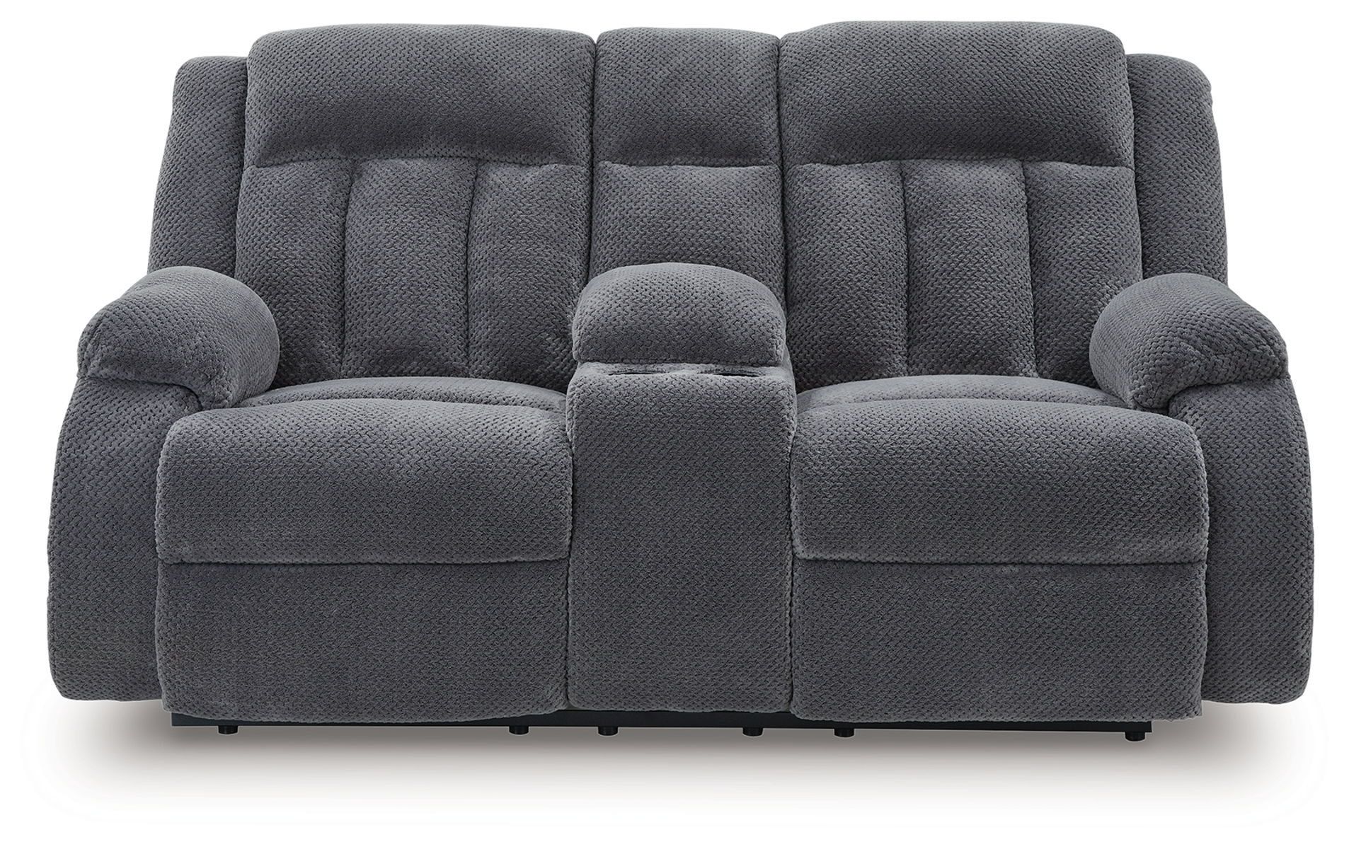 There’s no need to sacrifice looks for comfort—this power reclining loveseat with console serves up both, plus a richly relaxed sense of style. Its steel-hued velvet upholstery is ultra soft, with a plush waffle weave for an added layer of interest. The overstuffed pillow top armrests are custom made for lazy afternoon catnaps. A one-touch power control takes the pleasure of reclining to a higher level, while cup holders and USB charging help keep essentials close by.
