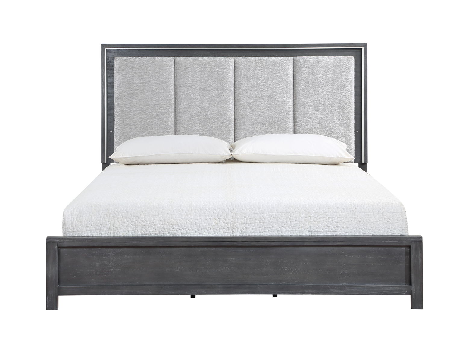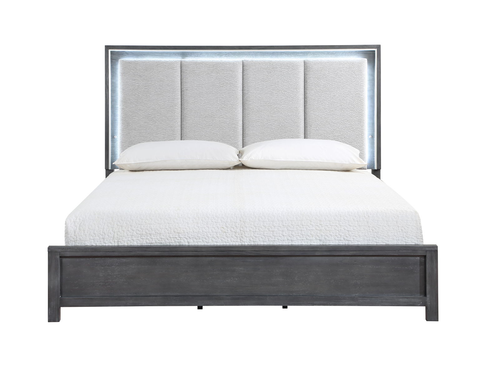 levate your bedroom with the timeless elegance of the Odessa Bed. Crafted from Pine solid wood and Mindy veneers, this bed exudes strength and durability, promising long-lasting comfort. The rich finish, meticulously applied through a multi-step process, accentuates the natural beauty of the wood, imparting a sophisticated charm to your space. Experience luxurious relaxation with the stately headboard featuring a plush fabric insert crafted from 100% polyester, offering both style and comfort. LED accent lighting around the panel adds a serene ambiance, perfect for unwinding after a long day. With its transitional design, characterized by clean lines and brushed finish hardware, the Odessa Bed effortlessly complements any decor style, making it a versatile addition to your bedroom sanctuary.