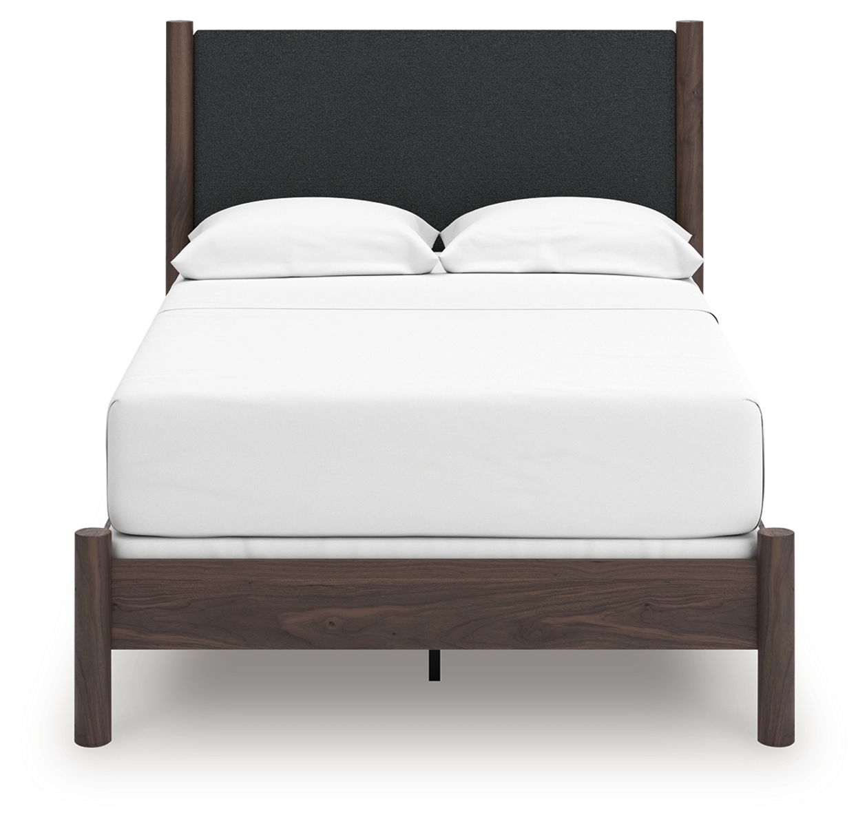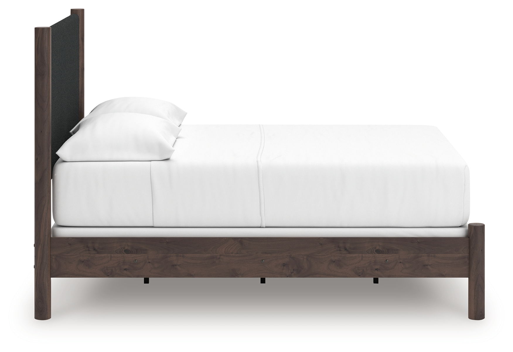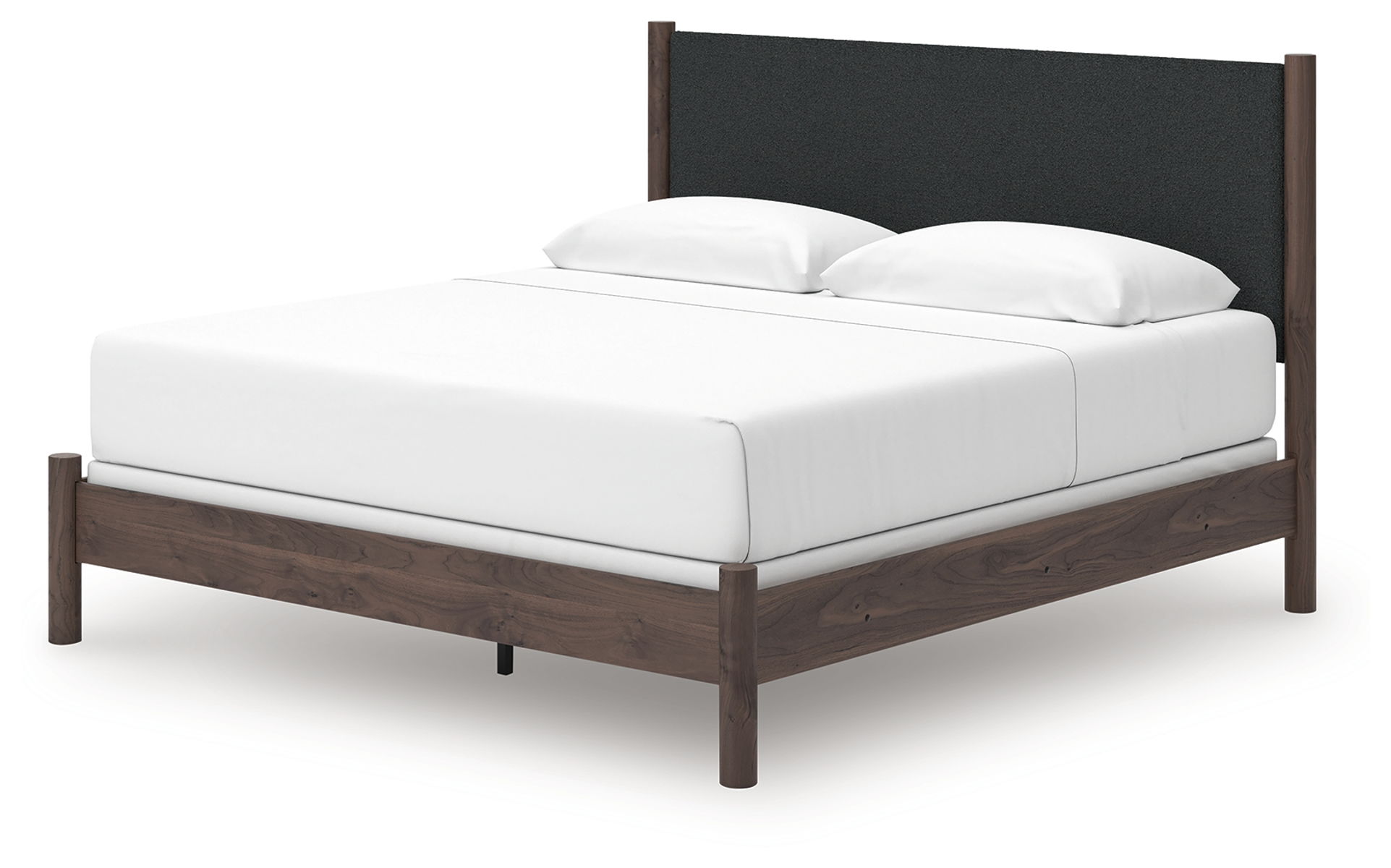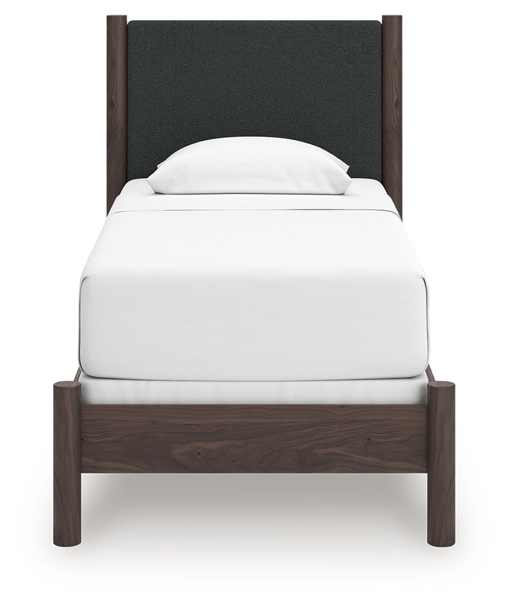 Crafted with both form and function in mind, this upholstered panel bed brings a dash of retro-cool character to your modern boho aesthetic. Its textured headboard fabric adds a trend-right touch to the classic silhouette. Warmly welcoming with a rich brown finish, this bed pairs well with muted hues, earth tones and other neutrals alike. What a refined take on easygoing style.