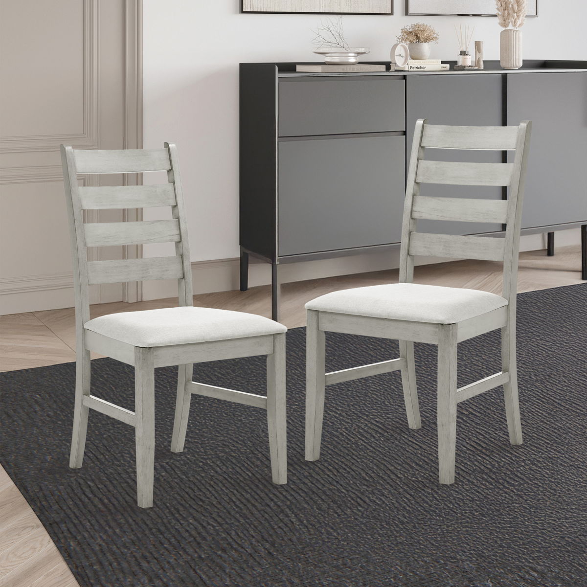 Enhance your dining experience with the Pascal Ladderback Dining Chairs. This set of two chairs is crafted from solid Rubberwood, ensuring long-lasting durability and stability. The chairs feature side stretchers for added strength, making them a reliable choice for everyday use. The rich, sophisticated finish is achieved through a meticulous multi-step process, including rub-throughs and glazing, which highlight the natural beauty of the wood. Each chair offers a comfortable seating experience with high-density foam cushions covered in easy-care 100% polyester fabric. Designed with versatility in mind, the Pascal Ladderback Dining Chairs boast subtly rounded edges, tapered legs, and an elegant ladderback style. These features create an upscale look that seamlessly fits into transitional, farmhouse, and contemporary decor styles. Combining quality craftsmanship with timeless design, these chairs are a perfect addition to any dining space.