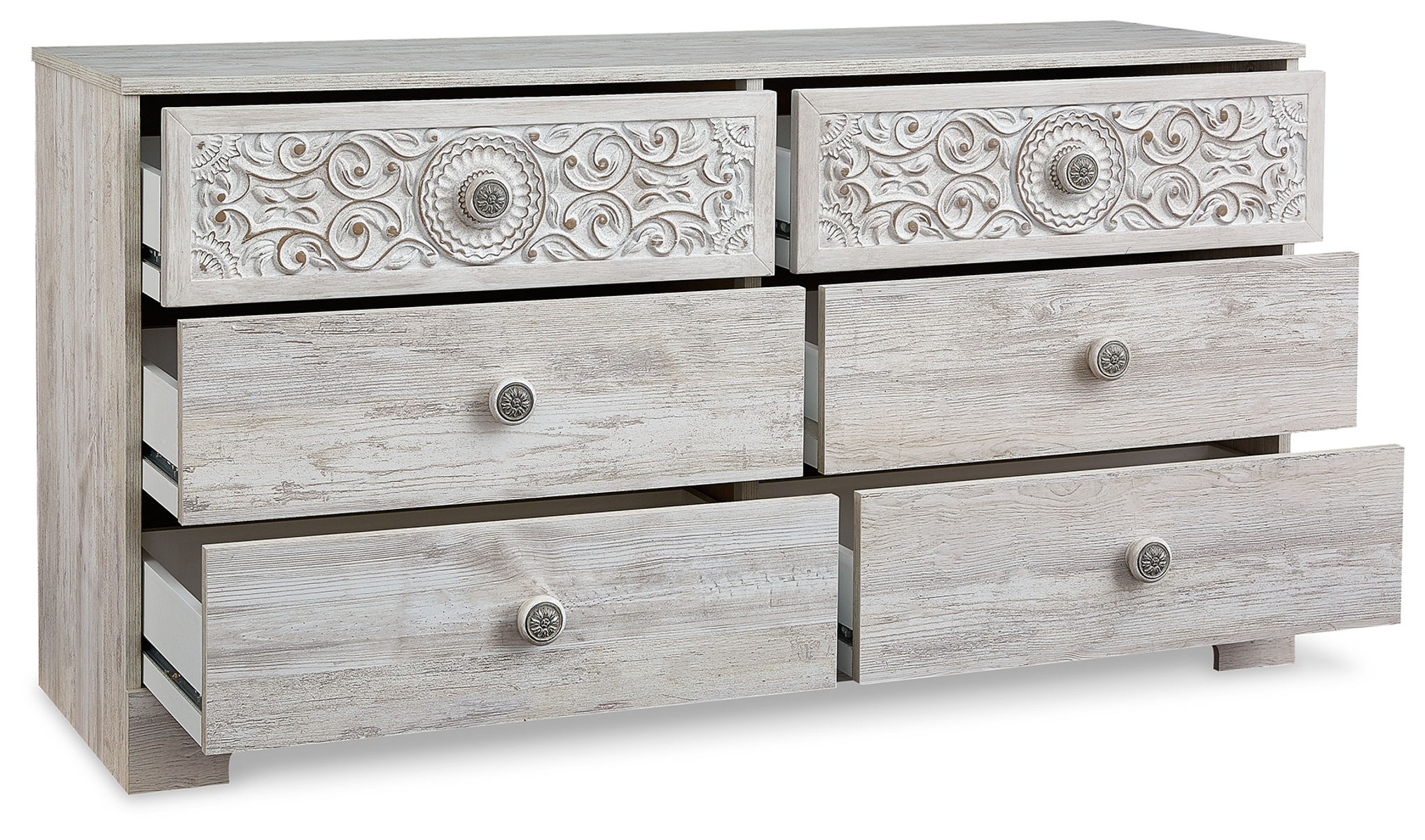 - 6 smooth-gliding drawers with vinyl-wrapped sides and back
