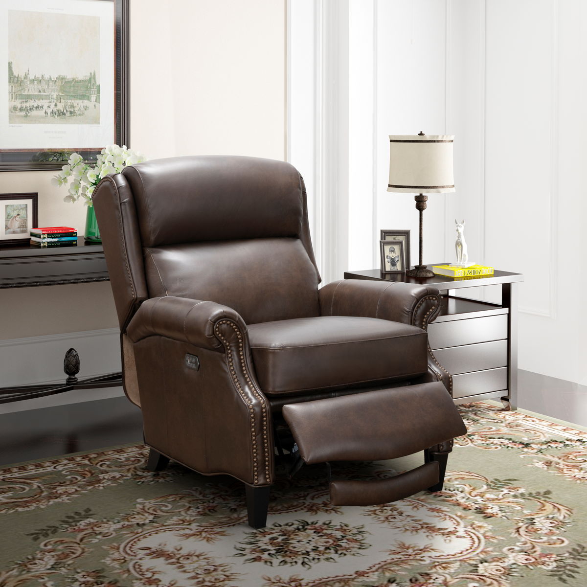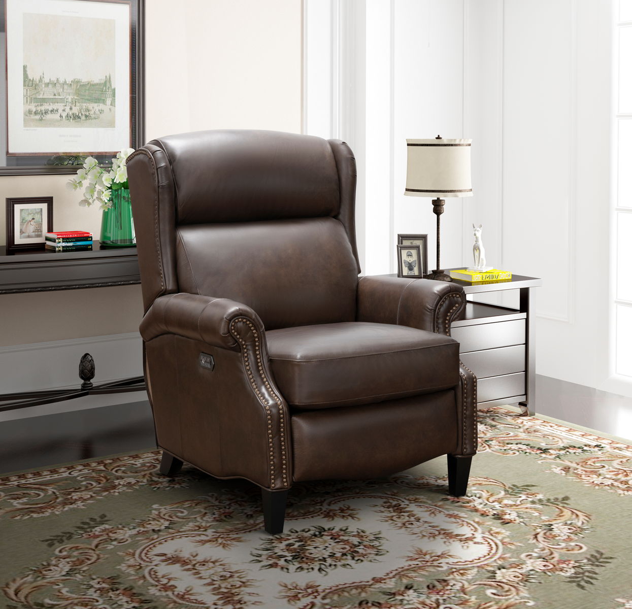 Triple Power Low Leg Recliner With Power Recline, Power Headrest And Power Lumbar. 43.4” High Winged Pub Back,Kneed Back Rolled Arms, Loose Non-Welted Boxed Seat Cushions With Pocketed Coil Springs Encased In Foam, Wrapped In Dacron With A Feather Blend Topper, Shaped Ottoman Board, Footrest Extension.