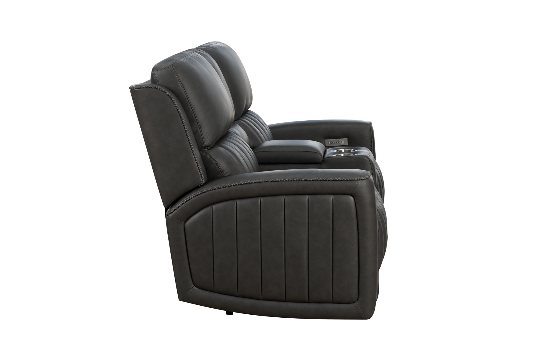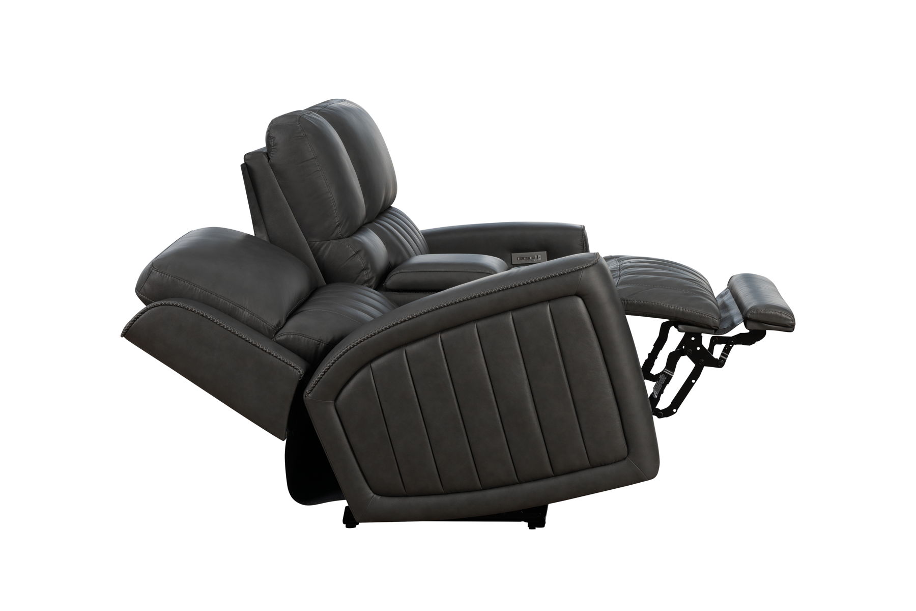 Sporty styling is found in this sophisticated modern reclining group. Features winged split pub channeled back with power headrest, power lumbar and drop-down table with 2 cup holders. Channeled pad over chaise pocketed coil seating fully supports your legs by eliminating pressure points. Large track arms with decorative whip stitching and welt details. Inside the arm power controller for easy access with USB port.