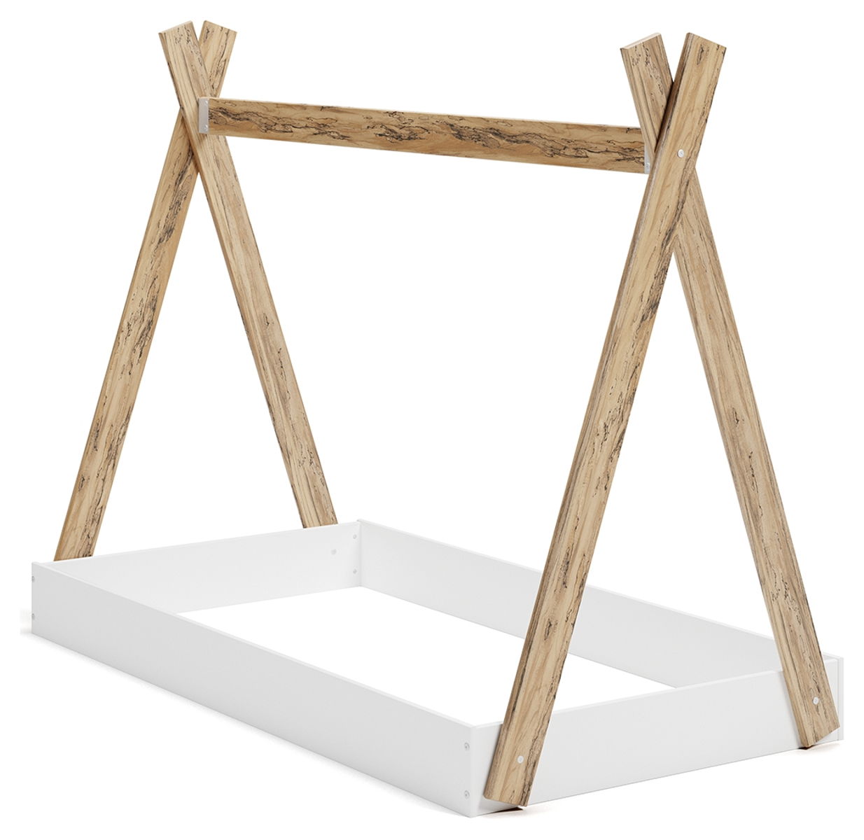 Adventure awaits with this tent complete bed in a box. The effortless blend of contemporary and casual styles creates an expressive two-tone look in matte and replicated sugarberry wood grain pattern. This complete bed in a box requires no additional foundation, making it a functional, yet unique, addition to your home.
