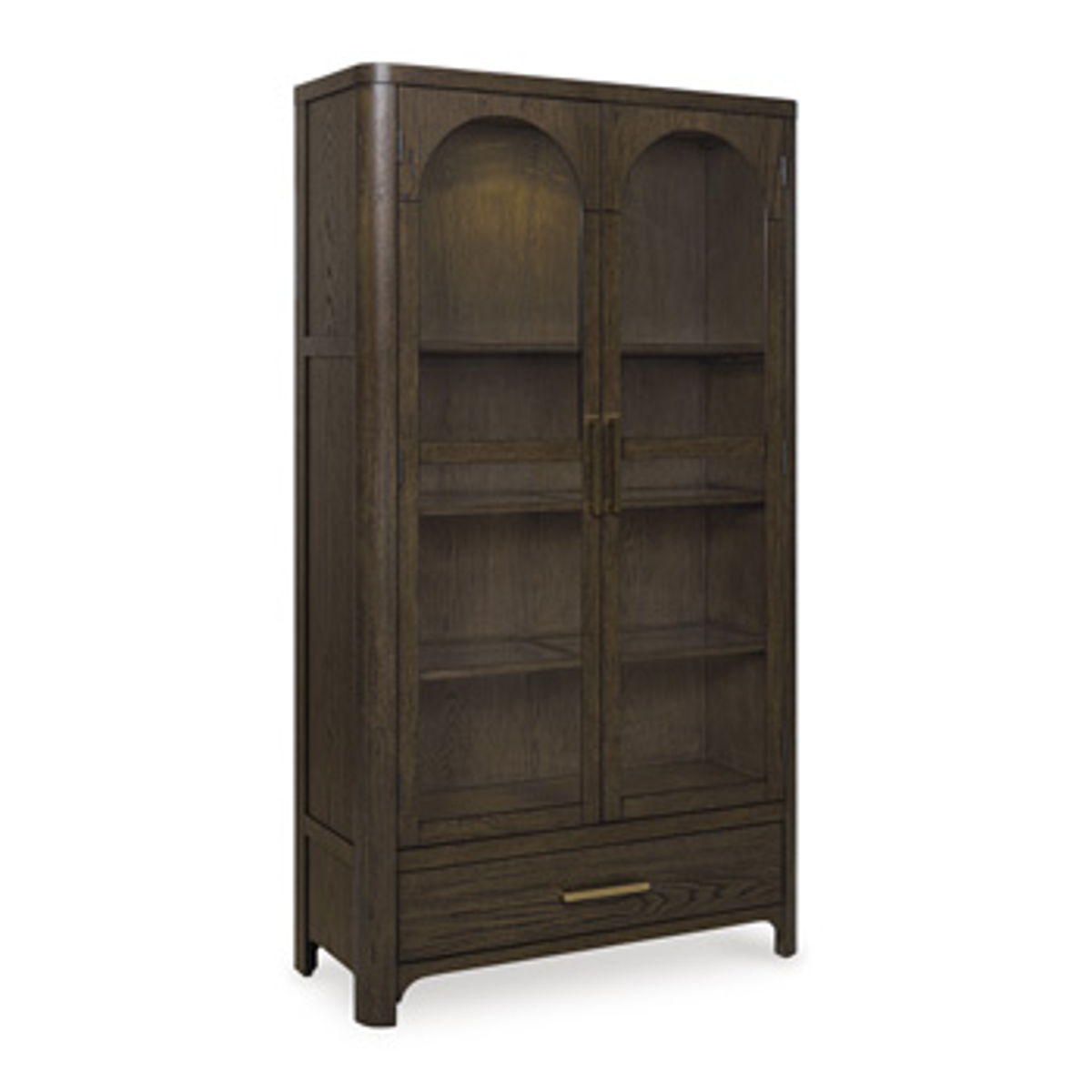 Anchor your dining space with the quiet confidence of this display cabinet. Double doors with gently curved glass panels and interior lighting allow you to display treasures in clean-lined style. A lower drawer discreetly keeps essentials out of sight. Burnished bronze-tone handles complete the modern aesthetic. Effortlessly refined in a rich burnished wood tone, this piece is an expertly crafted balance of luxury and livability.