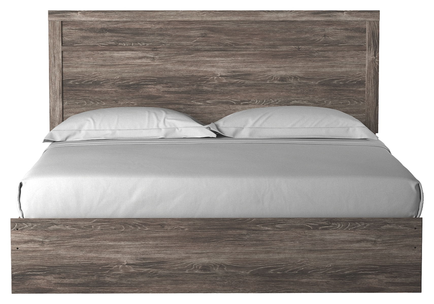 Rustic warm finish over replicated Oak grain with authentic touch. Large dark pewter color handles with an aged appearance accent cases. Side roller glides for smooth operating drawers. Mouldings across headboard give a thick planked look.