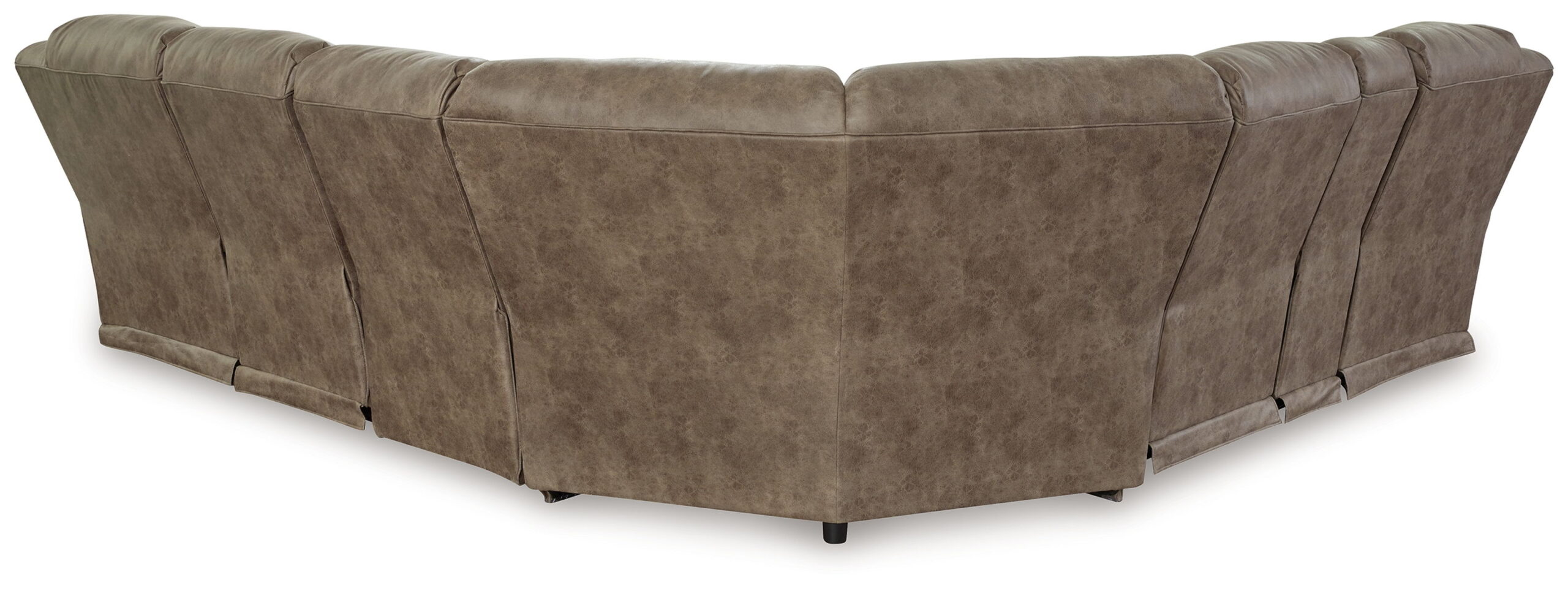 This reclining sectional is designed exclusively for those who are serious about R&R. Its overstuffed cushions and pillow top arms feel oh-so-plush, and the faux leather upholstery accented with jumbo stitching is silky soft. Go from upright to reclined relaxation with just one touch. A clever center console provides storage and keeps drinks at the ready.