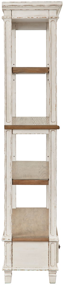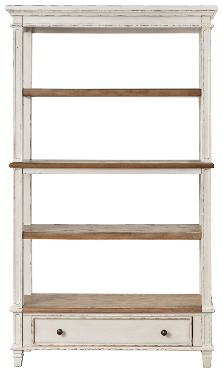 Elevating the art of traditional cottage styling, this bookcase is your heavenly home office realized. Its antiqued two-tone aesthetic blends a chipped white with a distressed wood tone top for added charm. The bookcase’s clever balance of shelf and drawer space beautifully works.