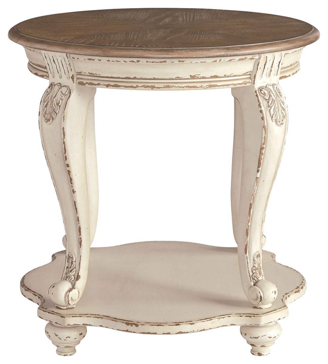Elevating the art of traditional cottage styling, this round end table is sure to serve you beautifully for years to come. Antiqued two-tone aesthetic blends a chipped white with a distressed wood finished top for added charm. Classic cabriole legs and shapely lower shelf are a lovely twist. Decorative corbels add refinement.