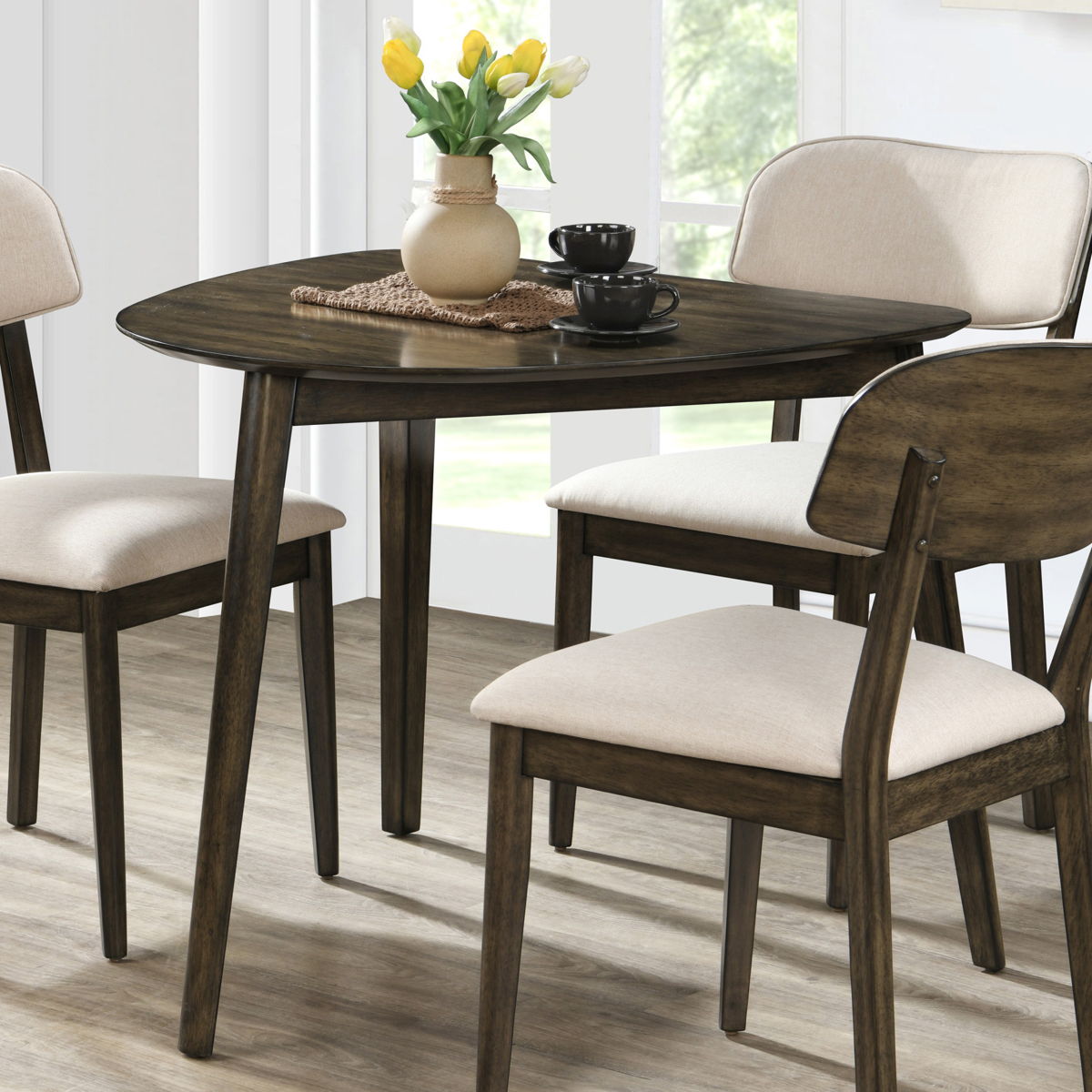 The Rex Guitar Pick Corner Table in Walnut offers durability and quality construction, crafted from solid rubberwood, manufactured woods, and oak veneers for maximum stability and longevity. Embracing a classic mid-century modern style, this piece features a minimalist design with neutral tones, clean lines, and rounded edges that impart a soft, organic feel. The angled, tapered legs evoke the essence of mid-century modern design. Its natural walnut finish is meticulously hand-rubbed with a clear topcoat to enhance the inherent beauty of the wood grain. Perfect for small spaces, this unique corner dining table comfortably seats two, making it ideal for kitchens, dorm rooms, and studios where compact dining solutions are needed. Choose the Rex Guitar Pick Corner Table for a blend of style, practicality, and lasting quality.