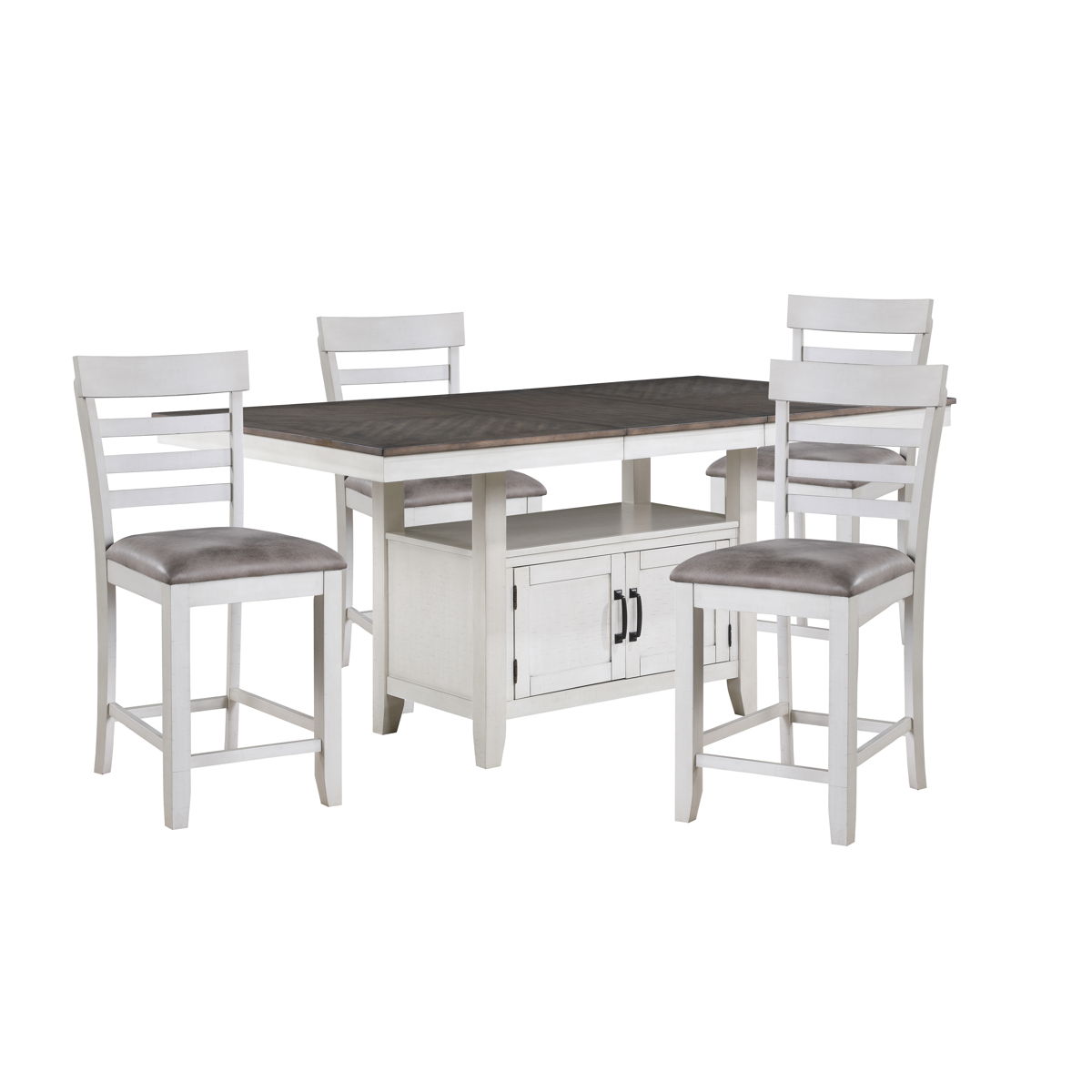 The Richland Dining Set brings a perfect mix of style, functionality, and comfort to your dining space. This set features a counter-height storage dining table and matching counter chairs, making it ideal for everything from family dinners to casual gatherings. Built to last, the set is crafted from solid Rubberwood, durable manufactured woods, and genuine Acacia wood veneers, offering lasting strength with the warm, natural beauty of real wood. The hand-applied vintage cream and gray finish highlights the wood’s unique grain patterns, adding a timeless, classic charm to your home. Need more space? The table extends to 90 inches with the included leaf, comfortably accommodating up to 8 guests. A built-in storage compartment keeps all your dining essentials close by, making serving and cleanup effortless. The classic ladderback chairs, with plush upholstered cushions, provide cozy seating that invites you to sit back, relax, and enjoy the moment. Perfect for those who value both style and practicality, the Richland Dining Set is a must-have for any home.