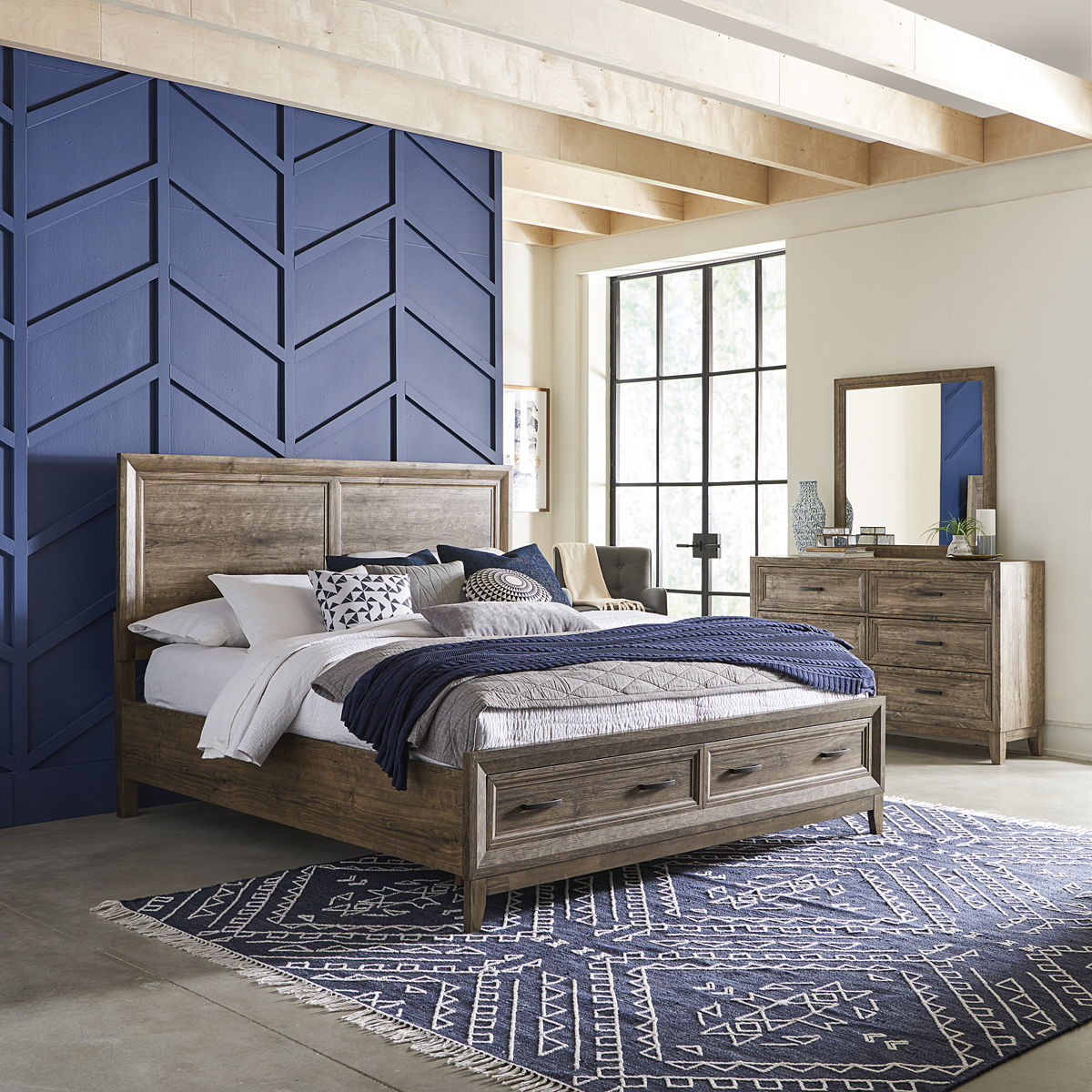 Enhance your home with the Ridgecrest storage bed, dresser, and mirror. Crafted of rubberwood solids with paper laminate, this kit features a cobblestone finish, picture frame cases, tapered feet, drawer fronts with canted moldings, paper laminate drawer interiors, and is accented with antique brass bar pull hardware. The storage bed features a headboard in a two-panel picture frame style and a footboard with two storage drawers with hook-on rails and a center support slat system. The dresser has six drawers and pairs well with the mirror with a beveled edge and included bolt-on supports. Ridgecrest is the essence of urban living furniture with its unique ability to fit many different styles from rustic to casual to contemporary.