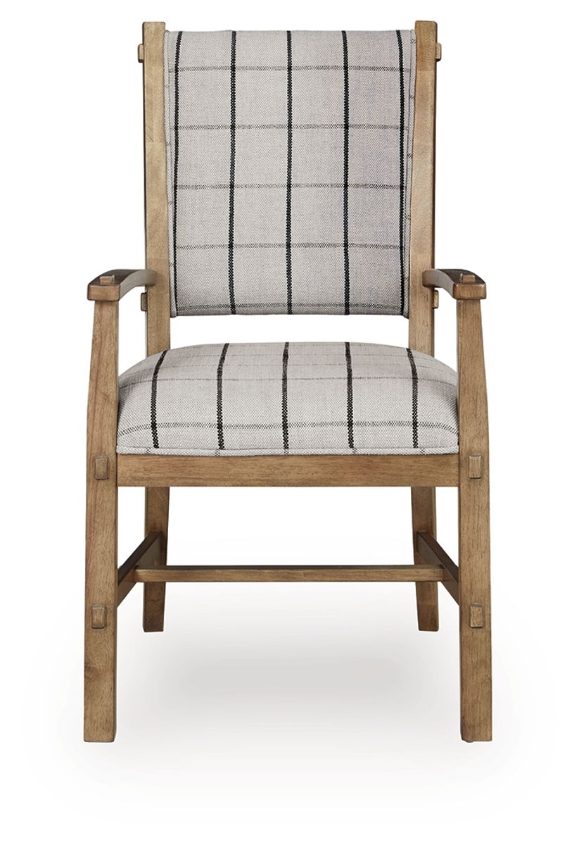 Rustic character with a dash of refinement. Outfitted with trendy plaid upholstery and completed with a natural finish, this dining arm chair combines the authentic beauty of wood with the must-have function of performance fabric. Loaded with charm, it completes your dining space with modern farmhouse flair.