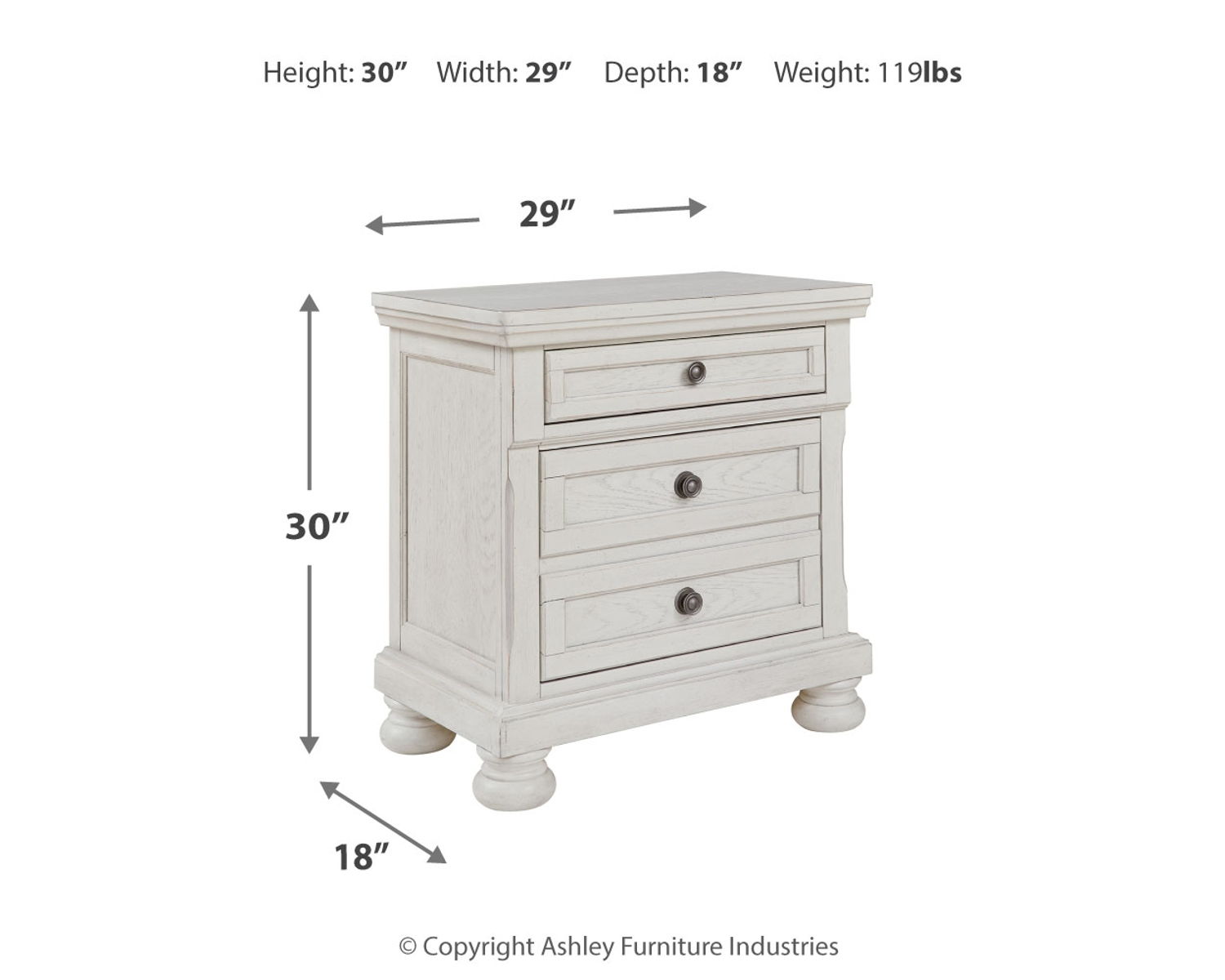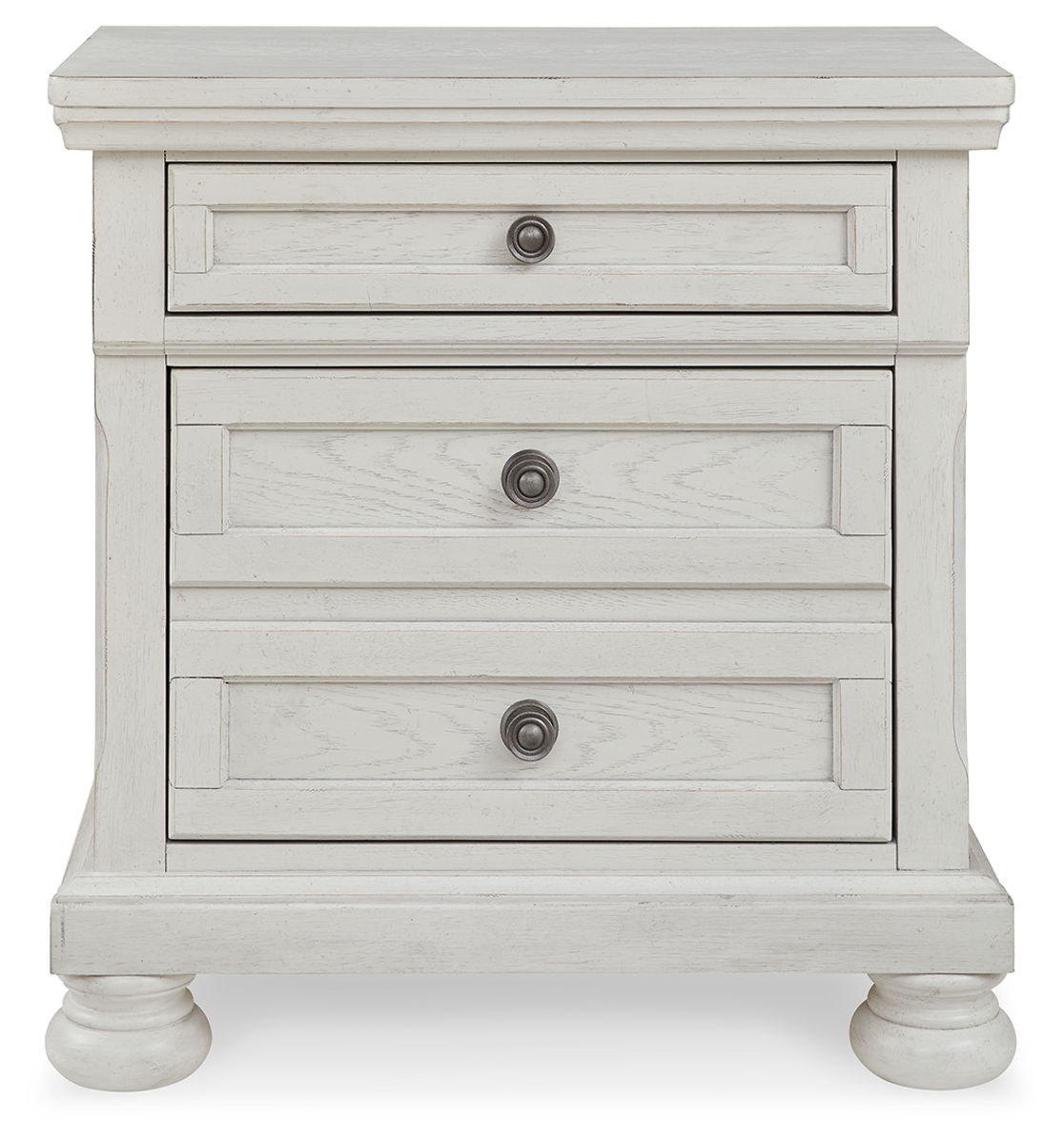 Elegant, timeless furnishings take your bedroom to the next level. Nothing does that better than this nightstand. The antiqued white finish with a wonderful grain texture radiates sophistication, while the dark bronze-tone hardware adds an ornate touch. A hidden pull-out tray behind the bottom drawer puts your small valuables out of sight. Felt finishing in the top drawer and a hidden pull-out tray rounds out the piece for the ultimate tasteful bedroom.
