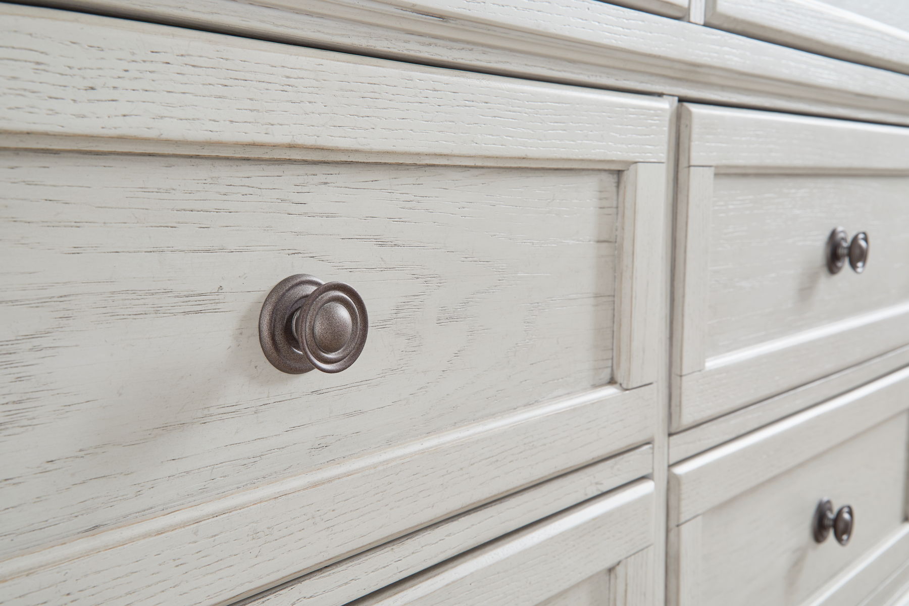 Elegant, timeless furnishings take your bedroom to the next level. Nothing does that better than this bedroom group. The antiqued finish with a wonderful grain texture oozes sophistication, while drawers with dark bronze-tone knobs add a sophisticated touch. Rounding things out, the subtle curve of the headboard keeps the look polished and poised.