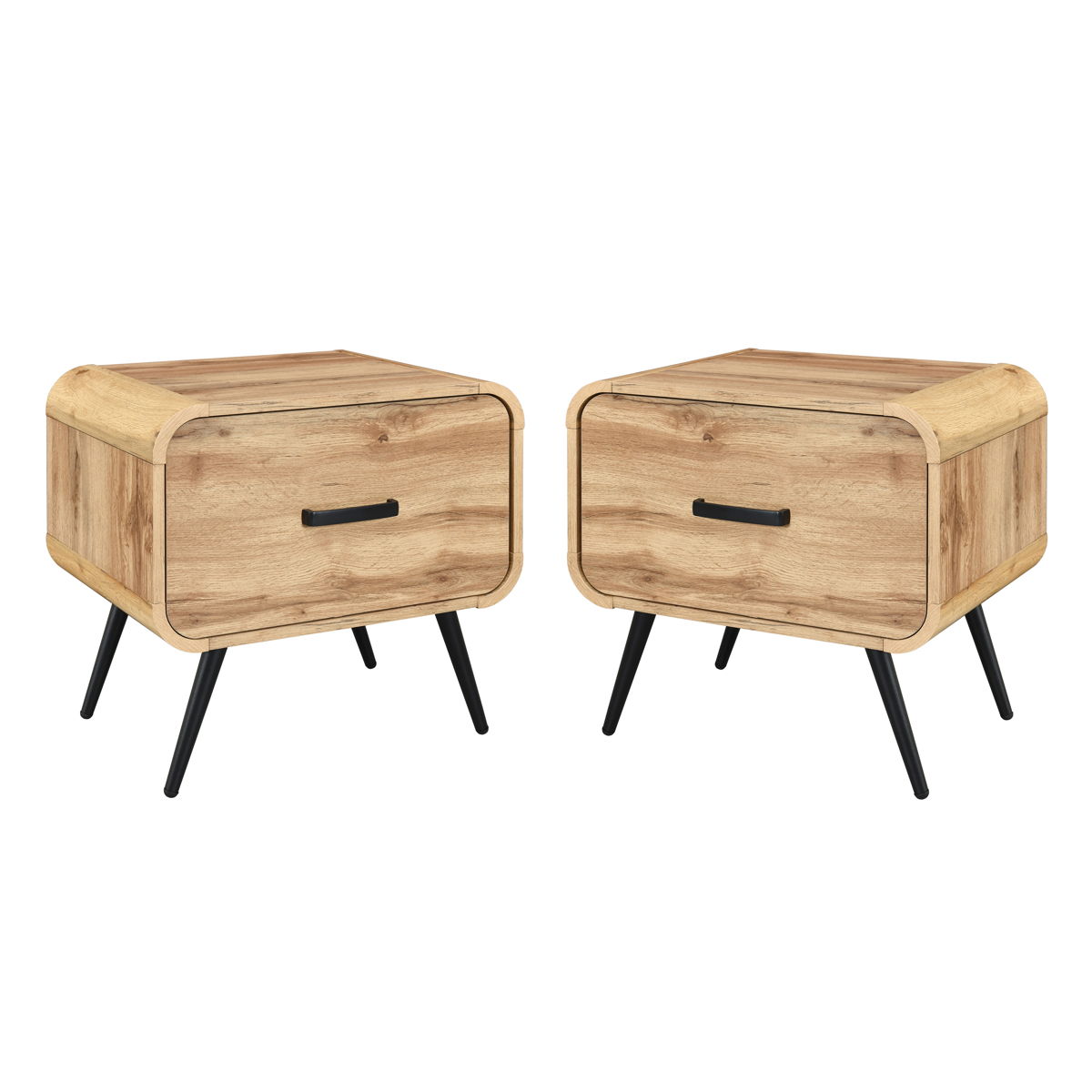 The Rowan One Drawer End Table blends mid-century modern style with practical design. Crafted from eco-friendly manufactured wood in a warm oak finish, it features rounded corners, tapered legs, and a smooth-glide drawer for bedside or living room storage. Subtle black accents add a modern touch. Assembly takes about 30 minutes with included instructions—perfect for adding sleek, functional charm to any space.