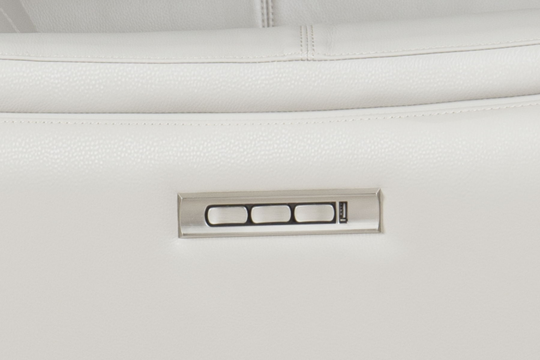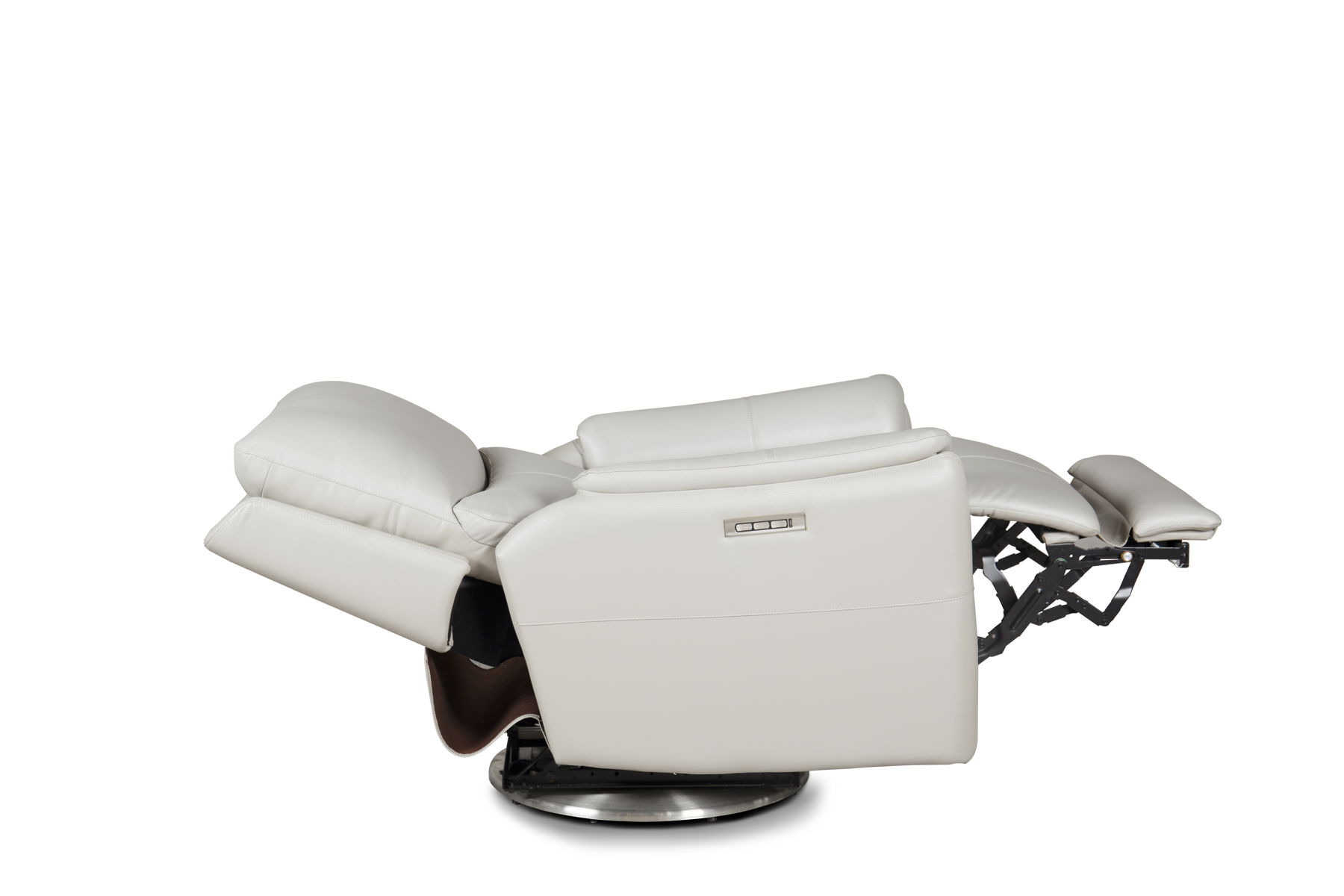 Modern swivel triple power recliner with power recline, power headrest, and power lumbar. Features lay flat mechanism, steel seat box, and 3” footrest extension. Split pub back design with lumbar pillow, flared arms with tailored plush arm pillows, and pad over chaise bucket seating to fully support your legs by eliminating pressure points. Outside controller has USB charging port. Single need top stitching details.