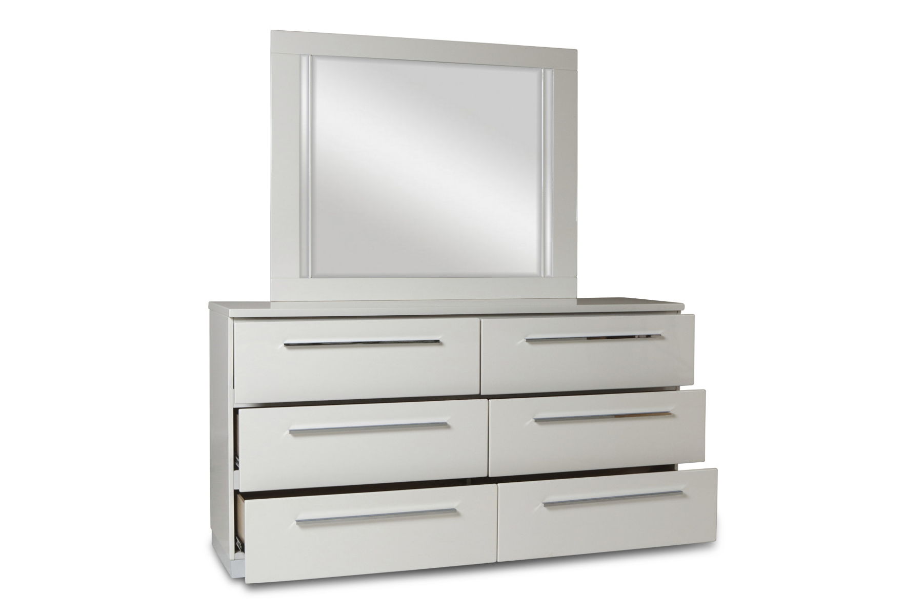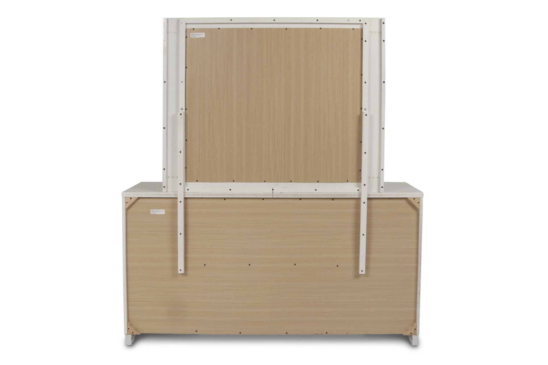 Complete your bedroom with the Sapphire Dresser Mirror in high gloss white. Expertly crafted from high-quality manufactured wood, this mirror features a flawlessly smooth, ripple-free surface and a glossy white laminate finish for a sleek, contemporary look. The wide frame, adorned with silver mylar, encases crystal-clear, low-distortion beveled glass for a perfect reflection. This mirror combines exceptional functionality with elegant design, adding sophistication to any space while seamlessly complementing modern interiors. Easy to clean and maintain, it’s an ideal choice for enhancing your bedroom’s style and functionality.