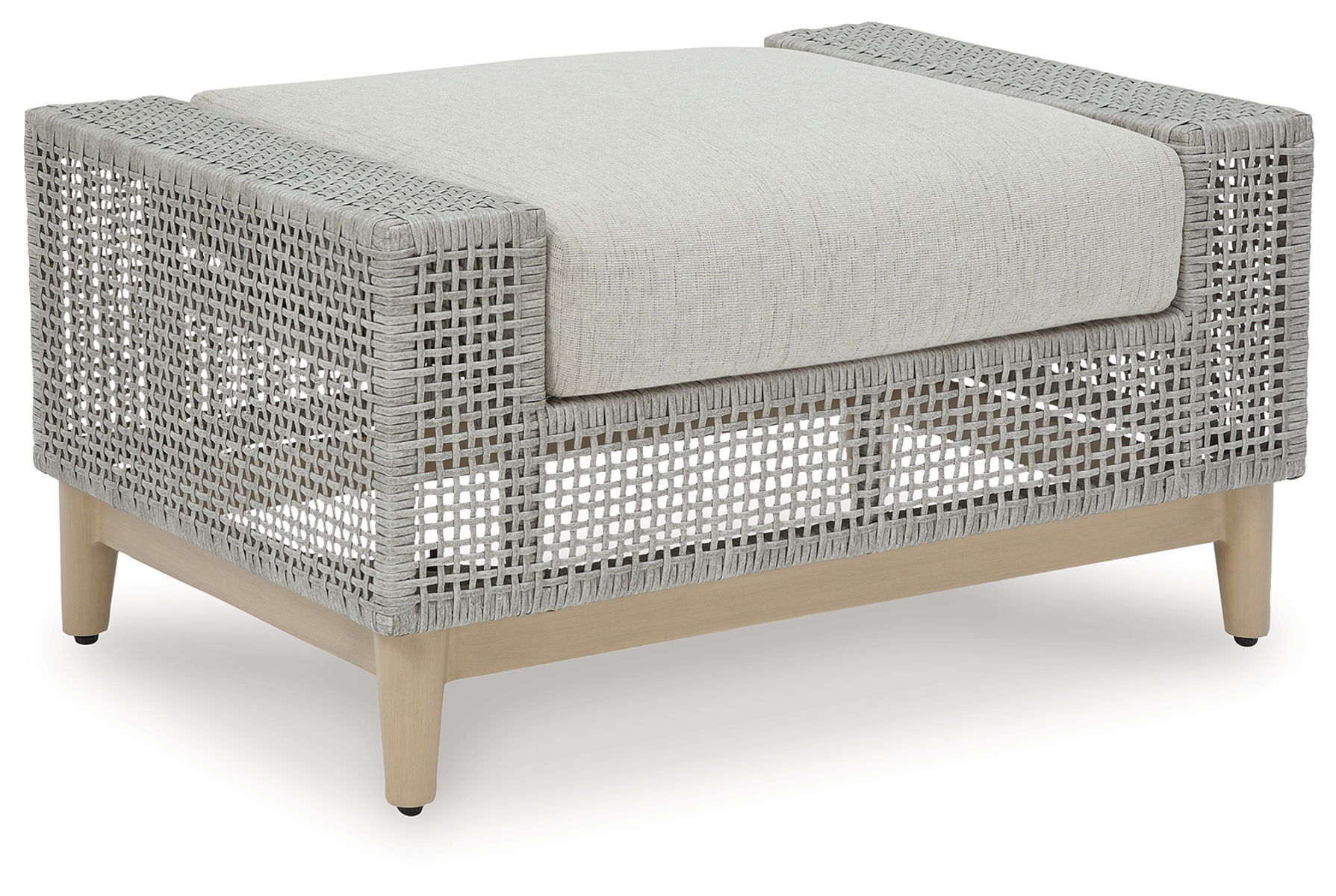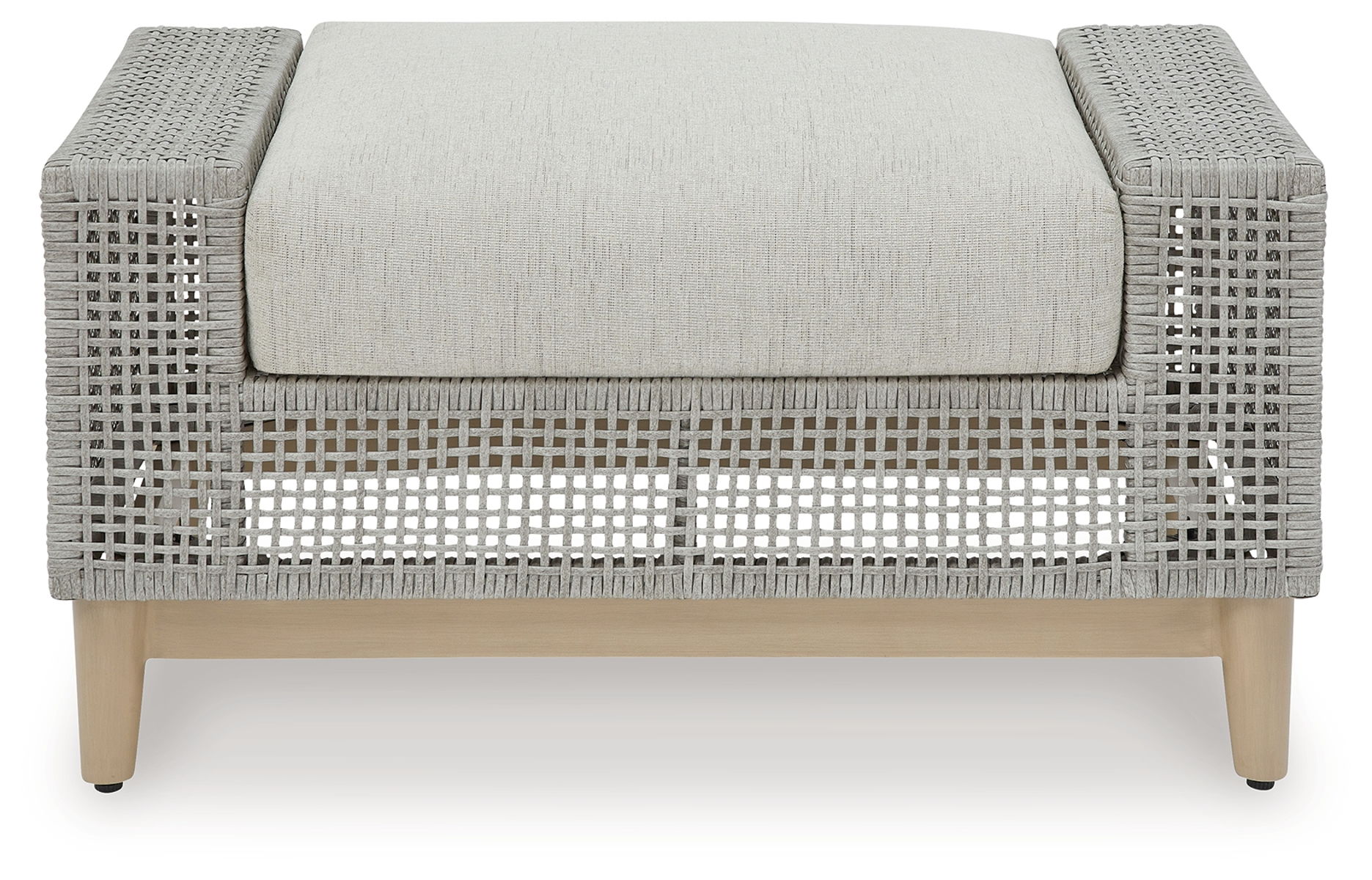This ottoman invites your casual contemporary style outdoors. With its resin wicker in a chic neutral hue, it expertly marries refined design with durability. Breezy summer mornings and cold winter nights are made all the more comfortable with high-performance Nuvella+ fabric covering the cushion.