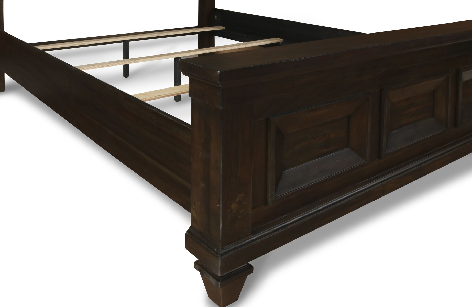 The Sevilla Wood Panel Bed is a masterfully crafted piece that embodies timeless craftsmanship and sophisticated design. Constructed from solid Acacia, enhanced by manufactured wood and Acacia wood veneers, it combines durability with the rich aesthetics of premium woodwork. The artisanal multi-step finish in walnut, featuring hand-distressed details like rasping and indentations, delivers an authentic vintage appeal that adds warmth and character to any bedroom. With its versatile design that blends traditional elegance, rustic charm, and colonial craftsmanship, this bed serves as a captivating focal point, making it ideal for classic, cozy, or historically inspired spaces. Its majestic features, including thick crown moldings, wide picture frame panels, and plank-style insets, ensure it not only commands attention but also offers a sturdy, reliable sleep environment. This is the perfect choice for those seeking a blend of beauty, durability, and a piece that truly stands the test of time.