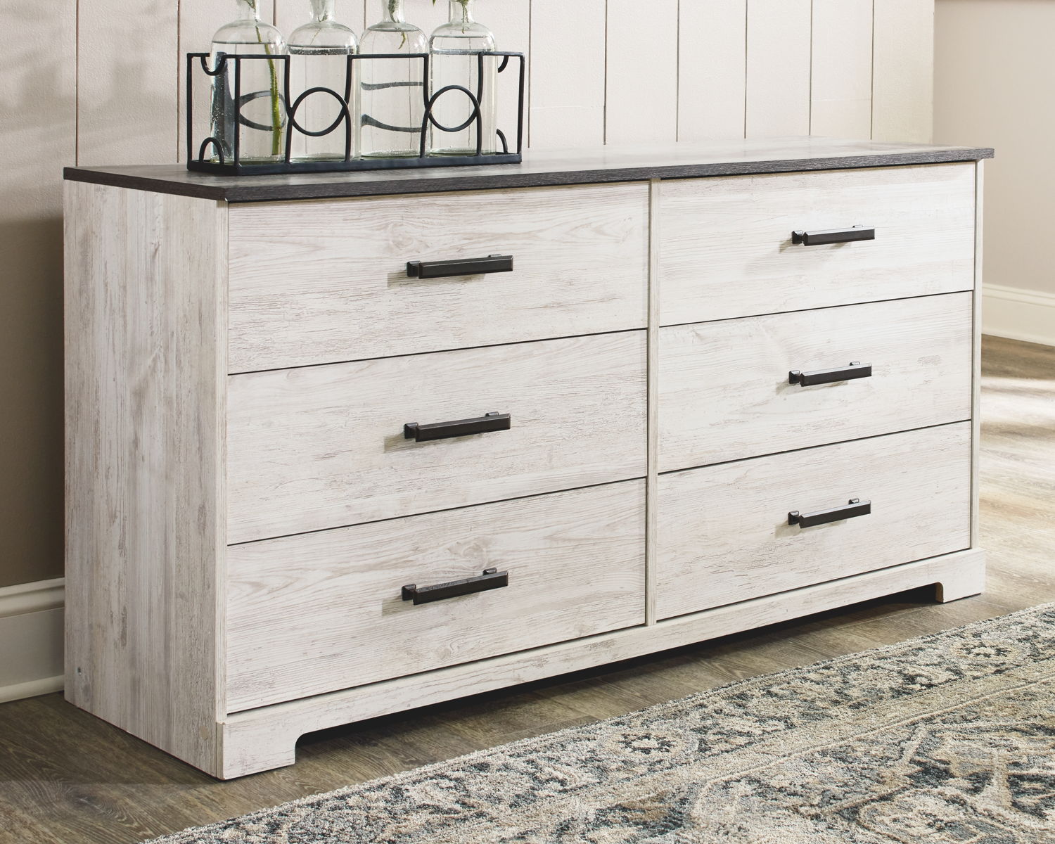 Give provincial a new meaning with the chic look of this dresser. The two-tone finish keeps this piece light and fresh while the warm pewter-tone hardware adds an industrial touch. The distressed body adds a delightfully homespun charm to your space.
