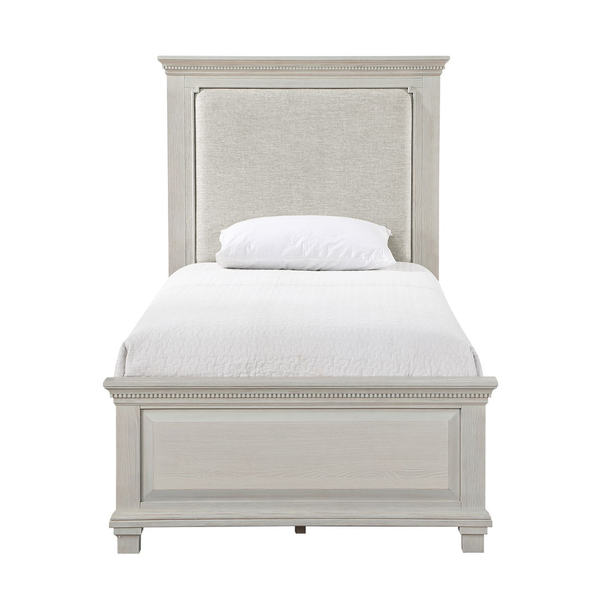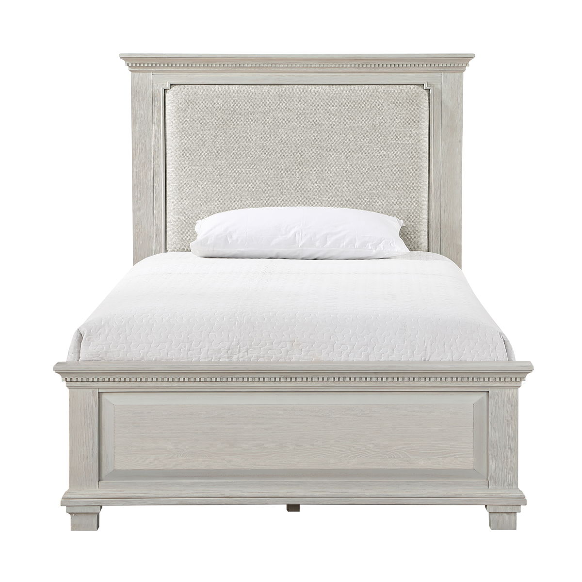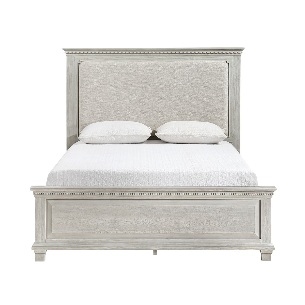 The Silver Sands Upholstered Panel Bed is a perfect blend of durability and style, making it a standout choice for any bedroom. Constructed from solid pine, manufactured woods, and oak wood veneers, this bed offers a robust and stable foundation. Its versatile design showcases a transitional style that merges clean, simple lines with a rustic wood finish, creating a calm and inviting atmosphere. The misty gray finish is meticulously hand-applied in multiple steps, resulting in a soft, weathered look that highlights the natural grain and mineral patterns of the wood. The bed”s elegant design features a raised panel footboard and a plushly padded headboard, complemented by traditional hardware and decorative dentil moldings for a touch of farmhouse charm. The sophisticated appeal of the nicely shaped crown moldings completes the look. Choose the Silver Sands Upholstered Panel Bed for a combination of quality construction and timeless design that enhances any bedroom decor.