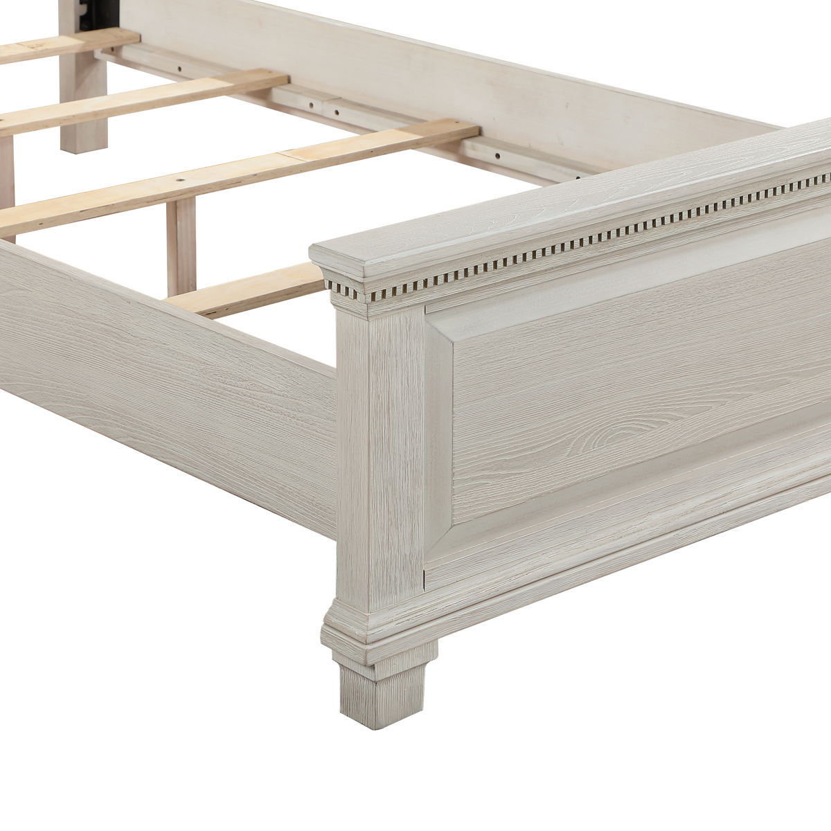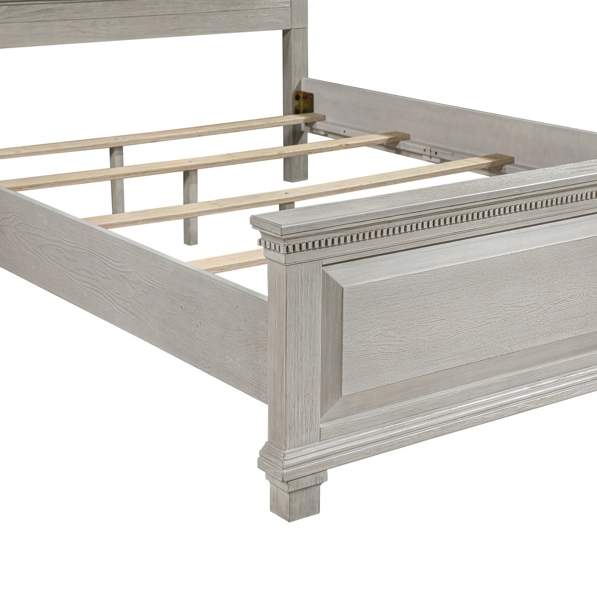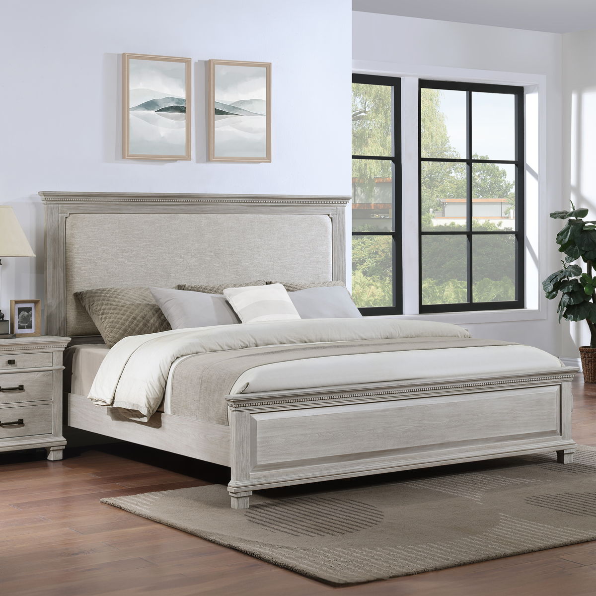 The Silver Sands Upholstered Panel Bed is a perfect blend of durability and style, making it a standout choice for any bedroom. Constructed from solid pine, manufactured woods, and oak wood veneers, this bed offers a robust and stable foundation. Its versatile design showcases a transitional style that merges clean, simple lines with a rustic wood finish, creating a calm and inviting atmosphere. The misty gray finish is meticulously hand-applied in multiple steps, resulting in a soft, weathered look that highlights the natural grain and mineral patterns of the wood. The bed”s elegant design features a raised panel footboard and a plushly padded headboard, complemented by traditional hardware and decorative dentil moldings for a touch of farmhouse charm. The sophisticated appeal of the nicely shaped crown moldings completes the look. Choose the Silver Sands Upholstered Panel Bed for a combination of quality construction and timeless design that enhances any bedroom decor.