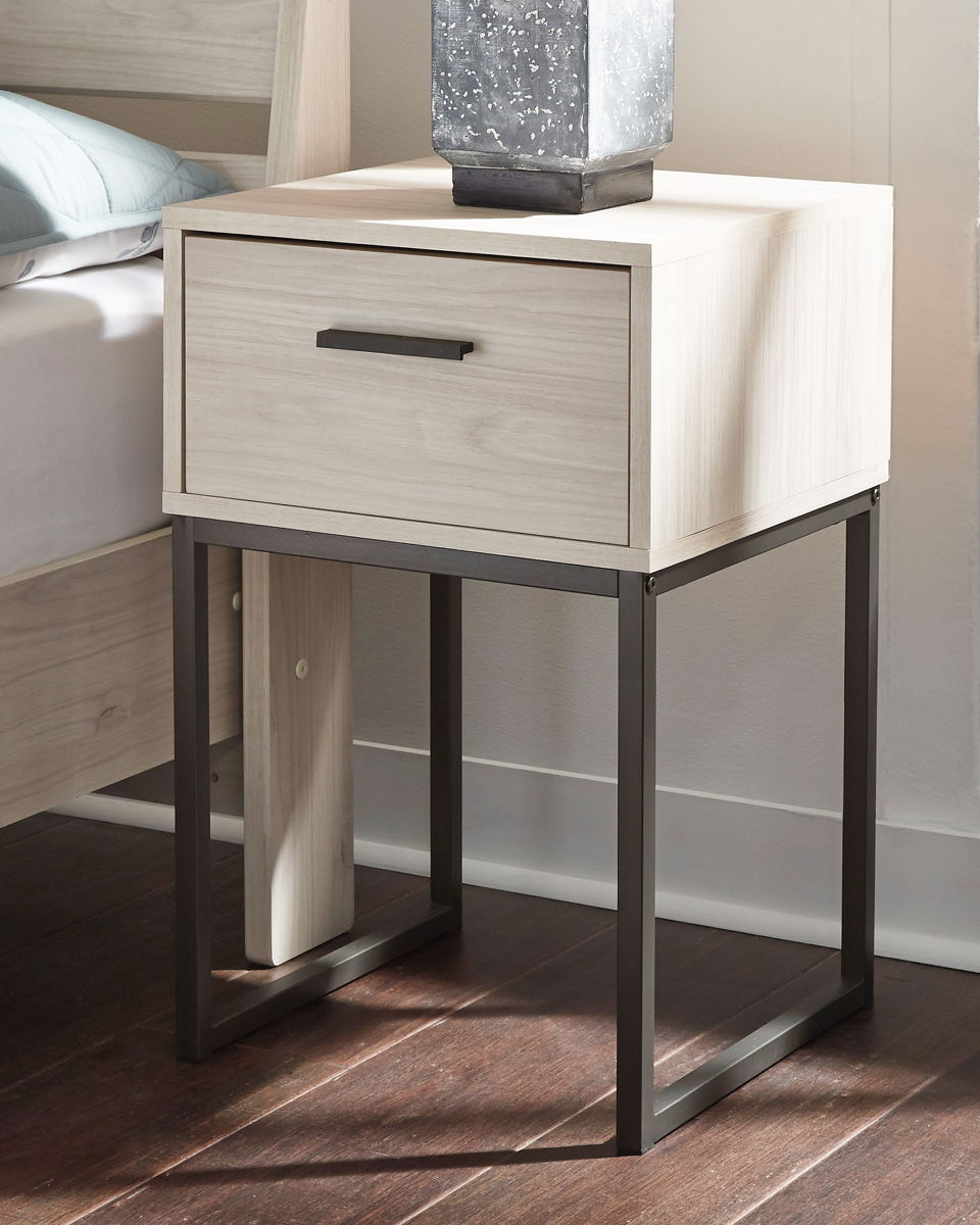 A finish over replicated oak grain with authentic touch. Contemporary handles in a dark colored finish. Spacious drawers with ball bearing glides offer a smooth opening and closing of the drawer. Vinyl wrapped drawer sides and back for extra durability.