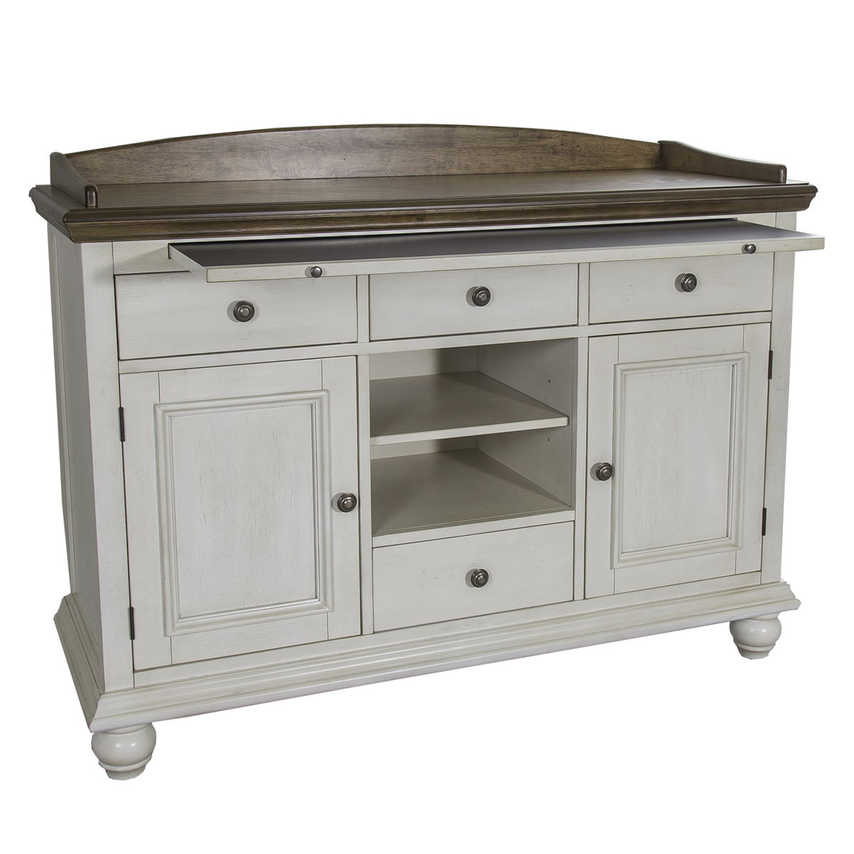 Accent your space with the Springfield sideboard. Crafted of rubberwood solids and white oak veneers, this piece features a honey and cream finish, four drawers with full extension guides, three felt lined top drawers and one fully stained bottom drawer, bottom case dust proofing, a pull out tray, a gallery style top, two wood framed doors with one adjustable shelf behind each, bun feet, and is accented with antique pewter knob pull hardware. Springfield offers a farmhouse design that can be traditional, casual, or even modern in style.