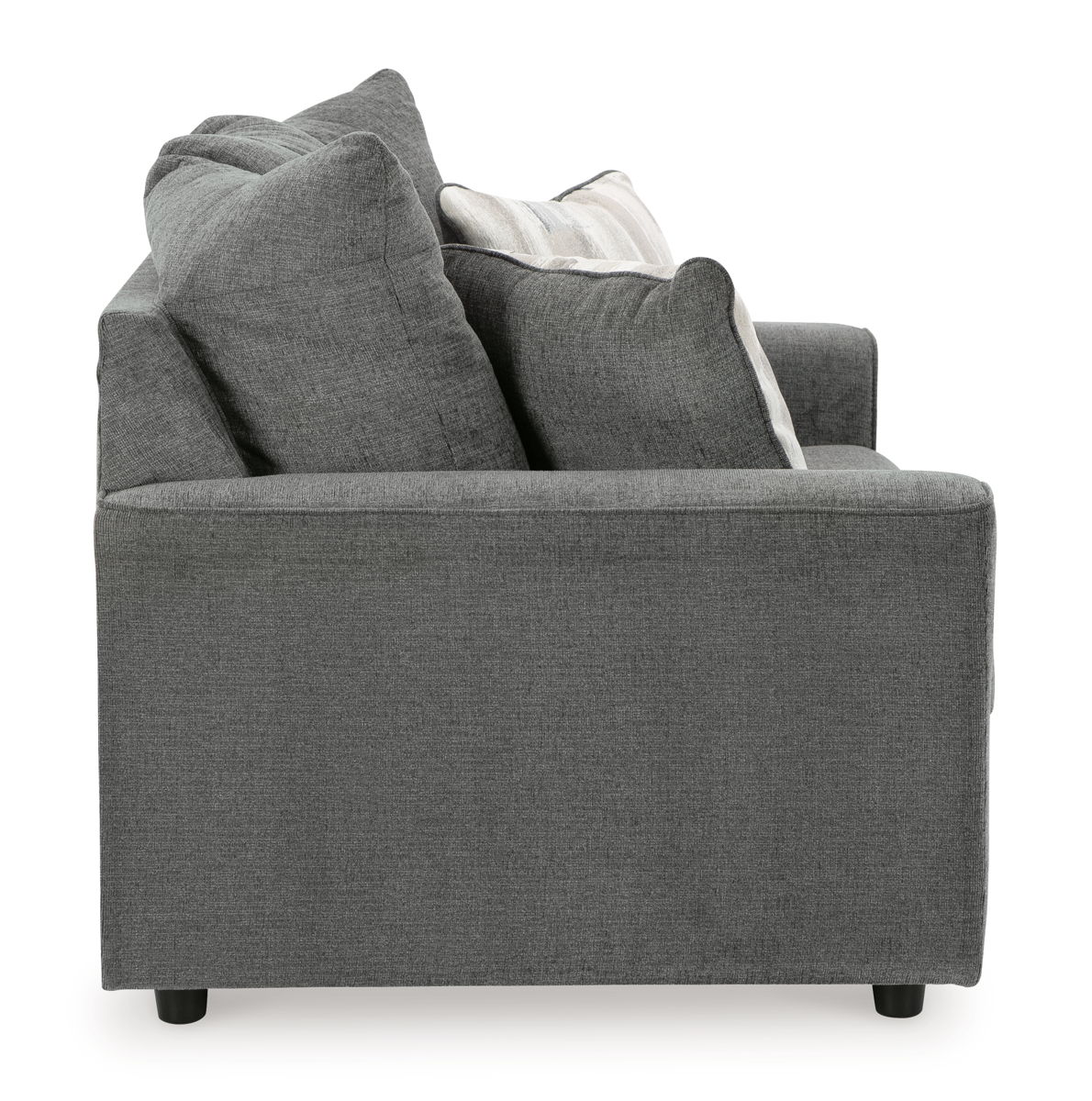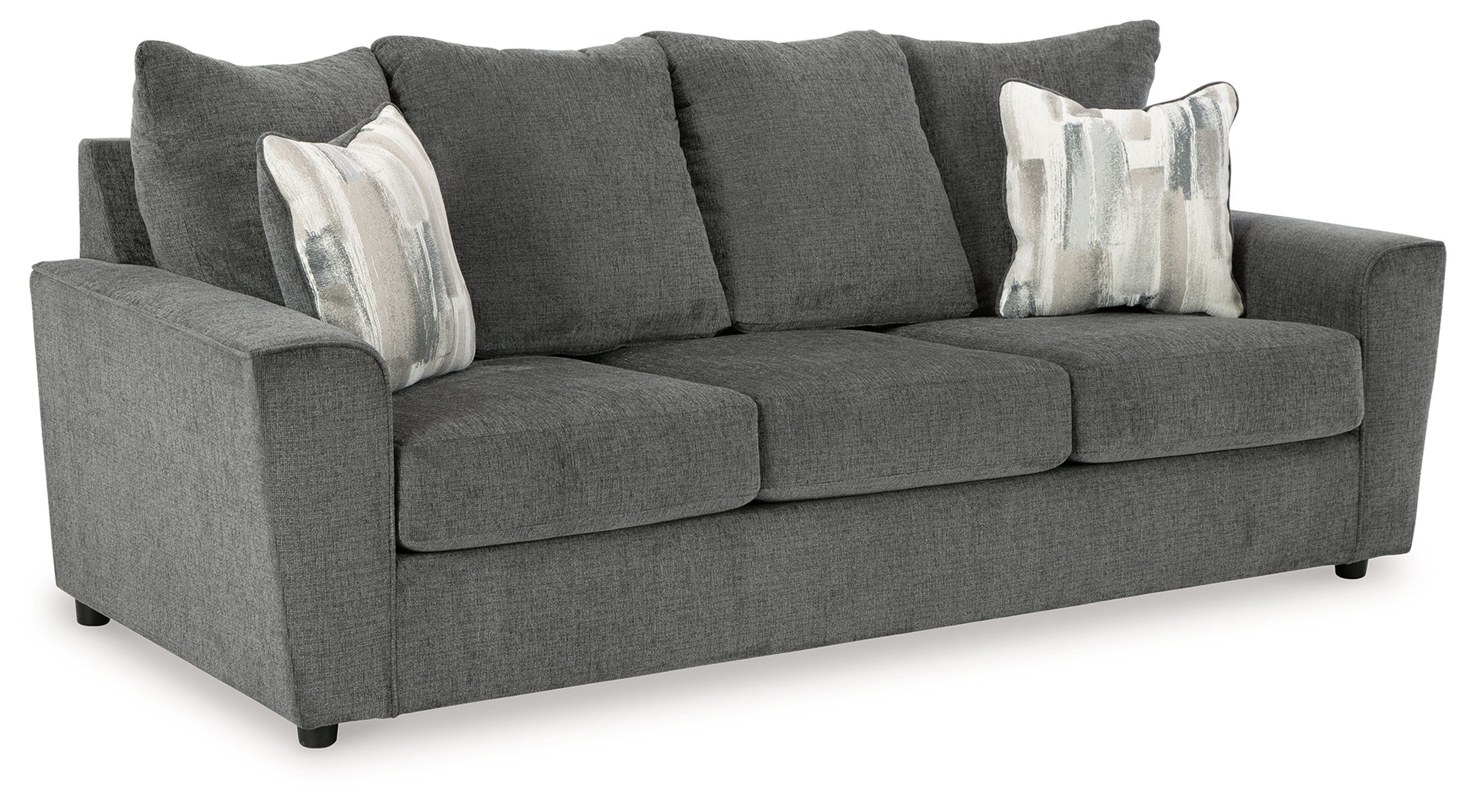 What’s new in neutrals? Shades of gray, of course. Embrace the sophisticated design trend with this gorgeous sofa and loveseat that offers a clean-lined, contemporary style at a comfortably cool price. Sure to lift your spirits, the plush chenille fabric is fabulously neutral. Contemporary flared arms give it a distinctive flair. This set also arrives with two cool brushstroke accent pillows to elevate the taste and comfort level.