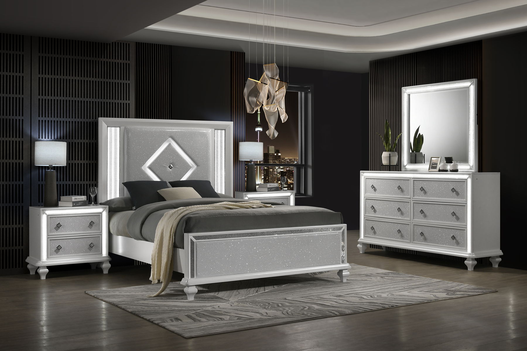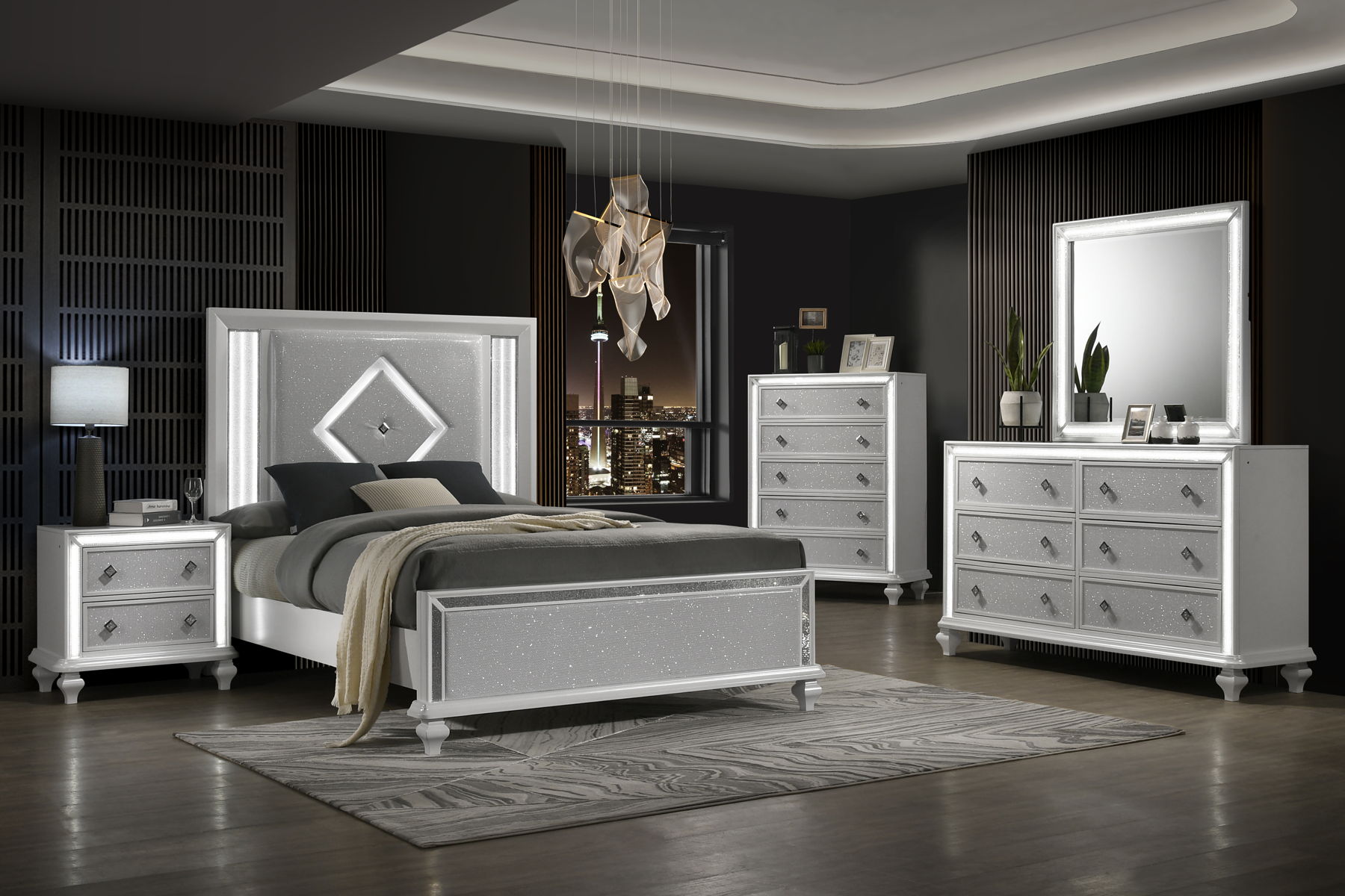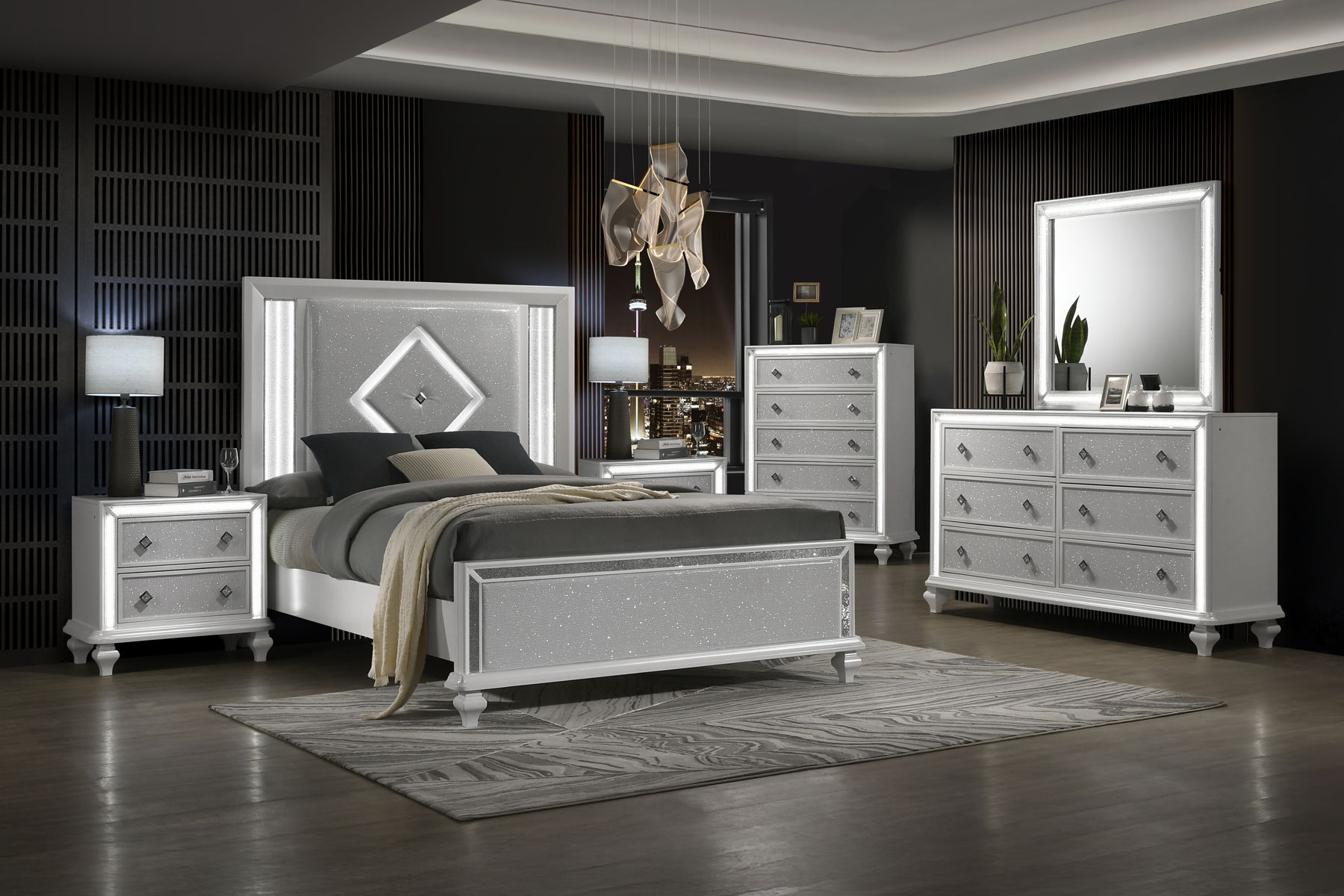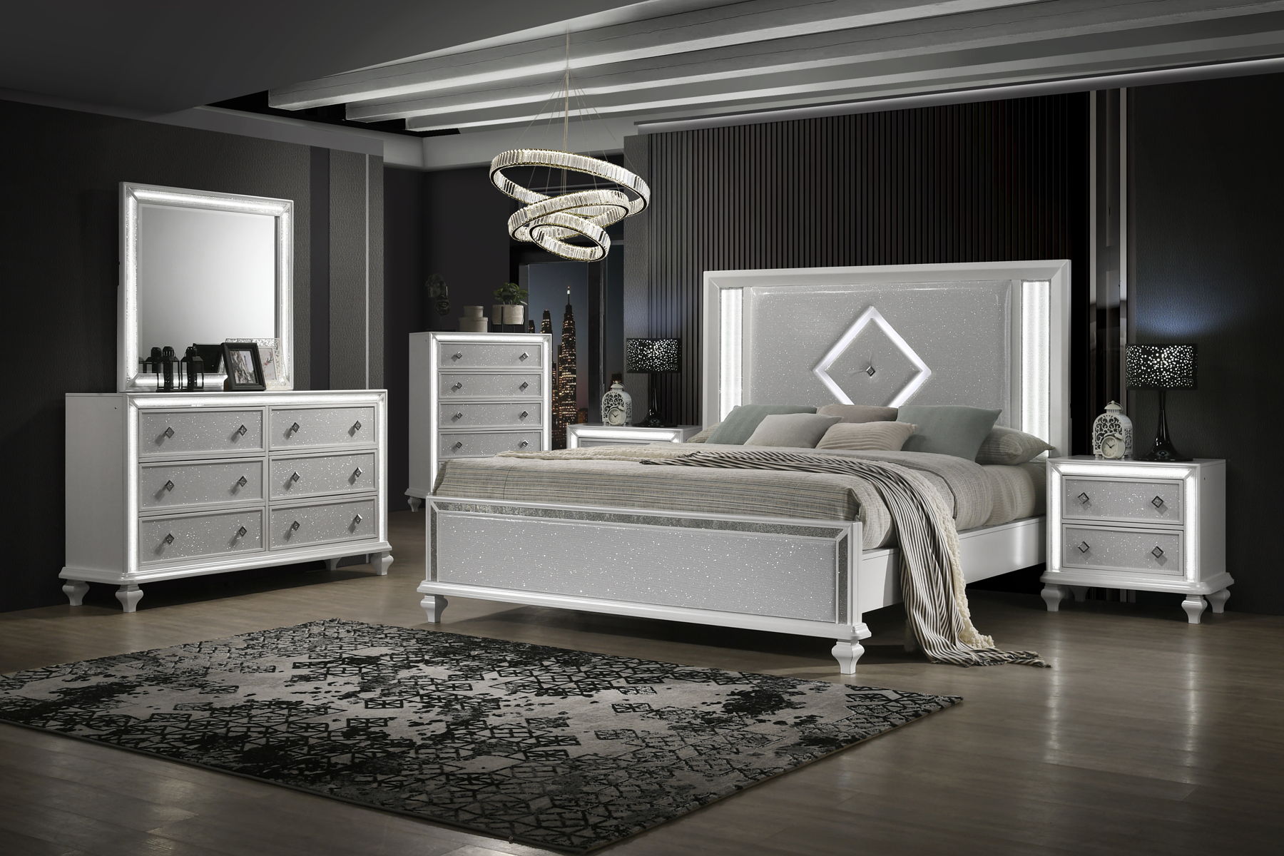 Elevate your bedroom decor to new heights with the Stardust Set. Crafted with precision and durability in mind, each piece is expertly constructed from manufactured wood with an eco-friendly decorative laminate and UV coating, ensuring long-lasting quality. The sleek finish exudes contemporary elegance, complemented by glamorous accents that add a touch of sophistication. Adorned with sparkling Poly/Cotton fabric and shimmering crystal hardware, this set radiates glamour and luxury. LED lighting throughout the collection creates an enchanting ambiance, accentuating its captivating style. Inside, drawers boast English dovetail joinery, full extension glides, finished interiors, and felt-lined top drawers for added protection of delicate items.