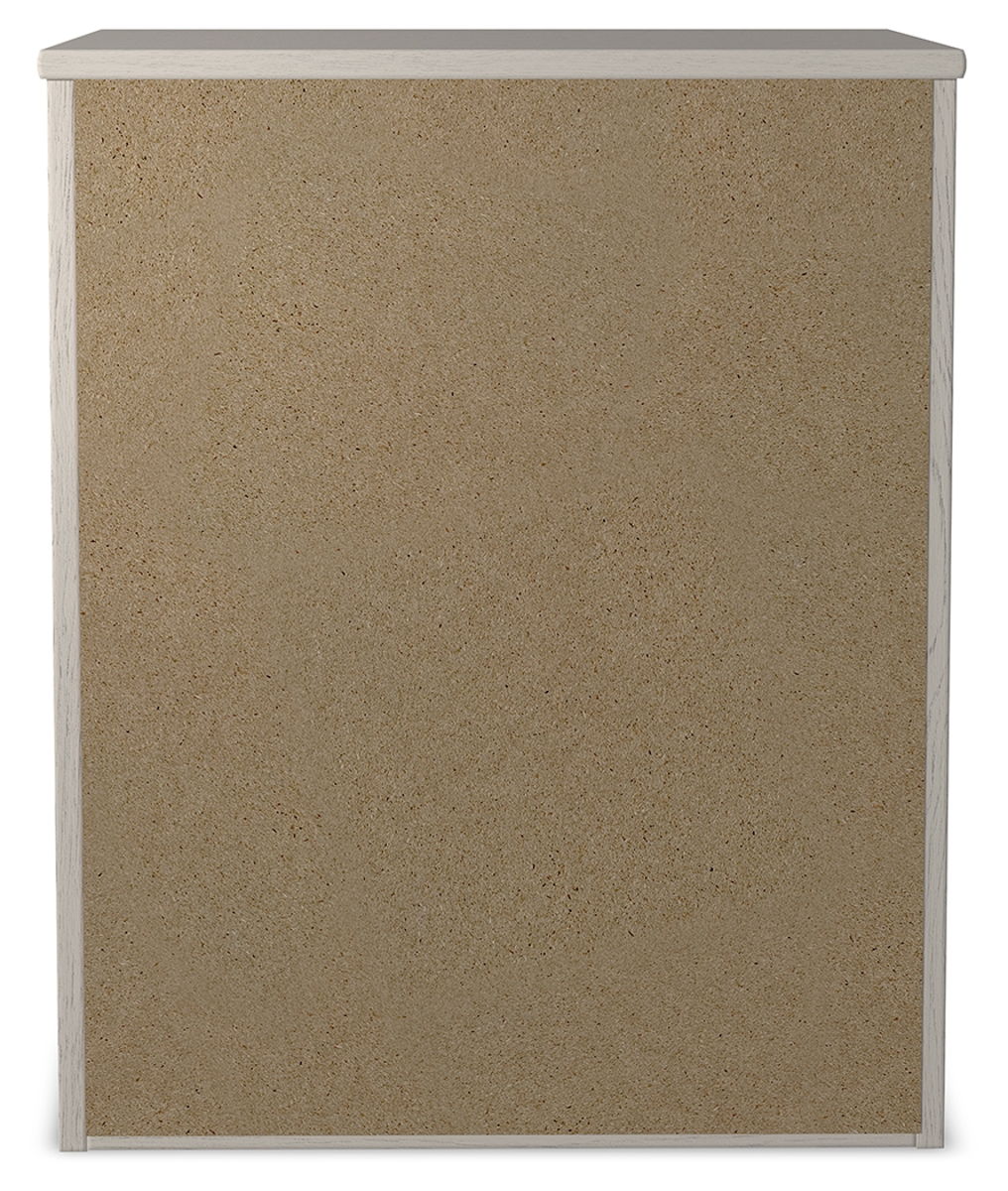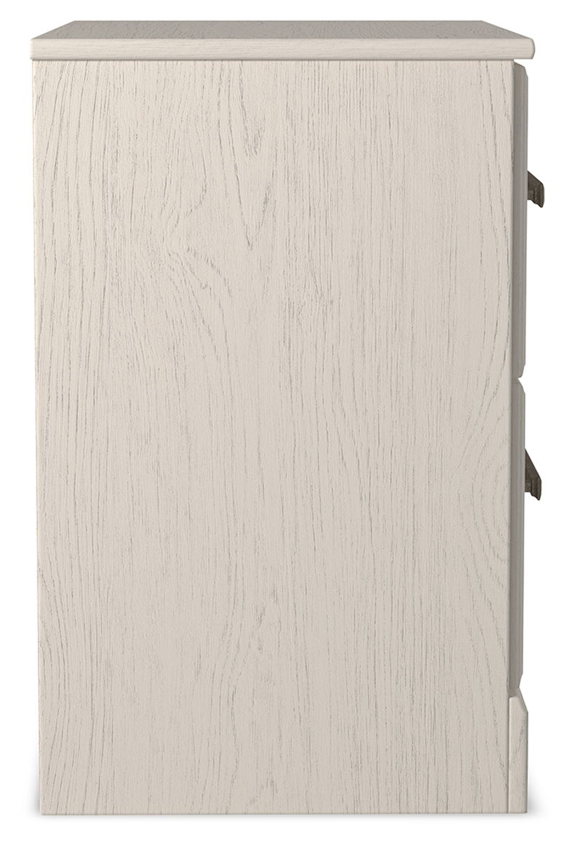 With its clean-lined look and modern attitude, this nightstand is a fresh style awakening. A crisp, white hue over subtle replicated wood grain easily complements other furniture finishes. Smooth drawer fronts with antiqued pewter-tone handles complete the aesthetic.
