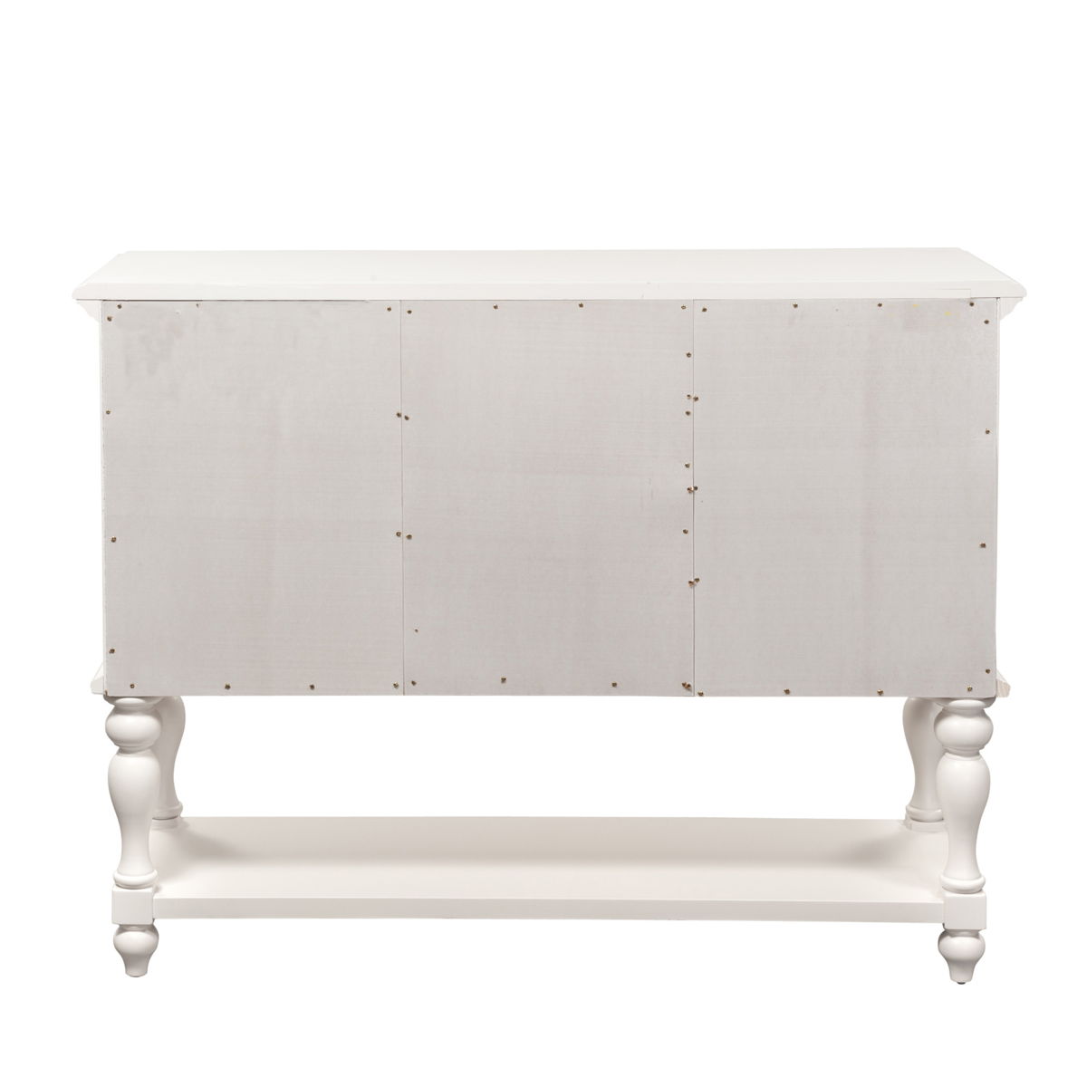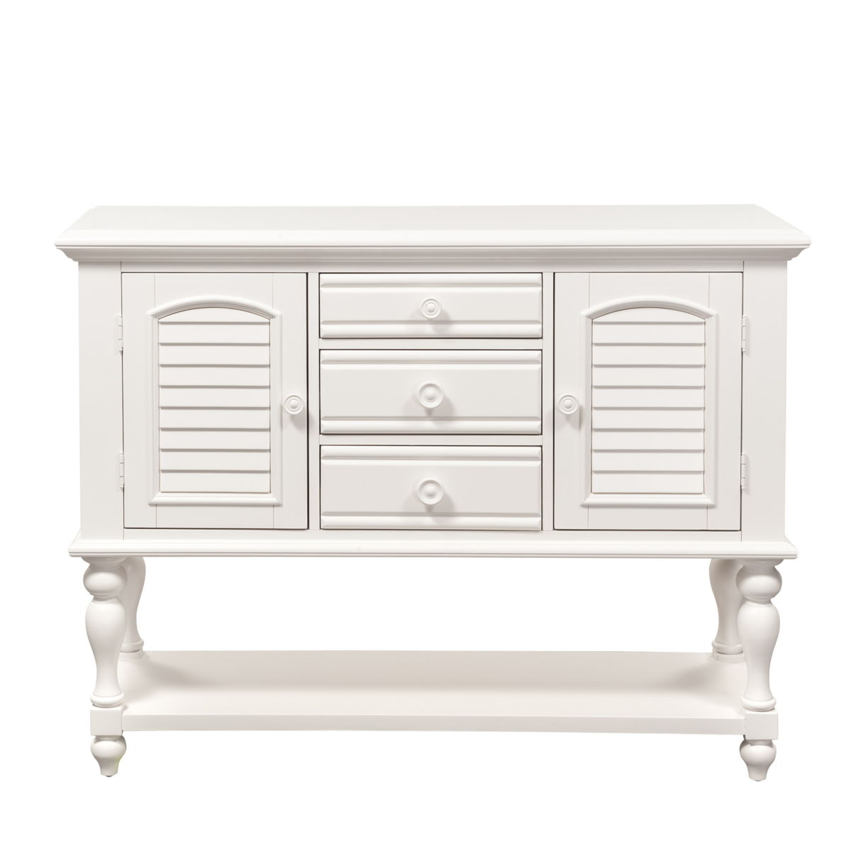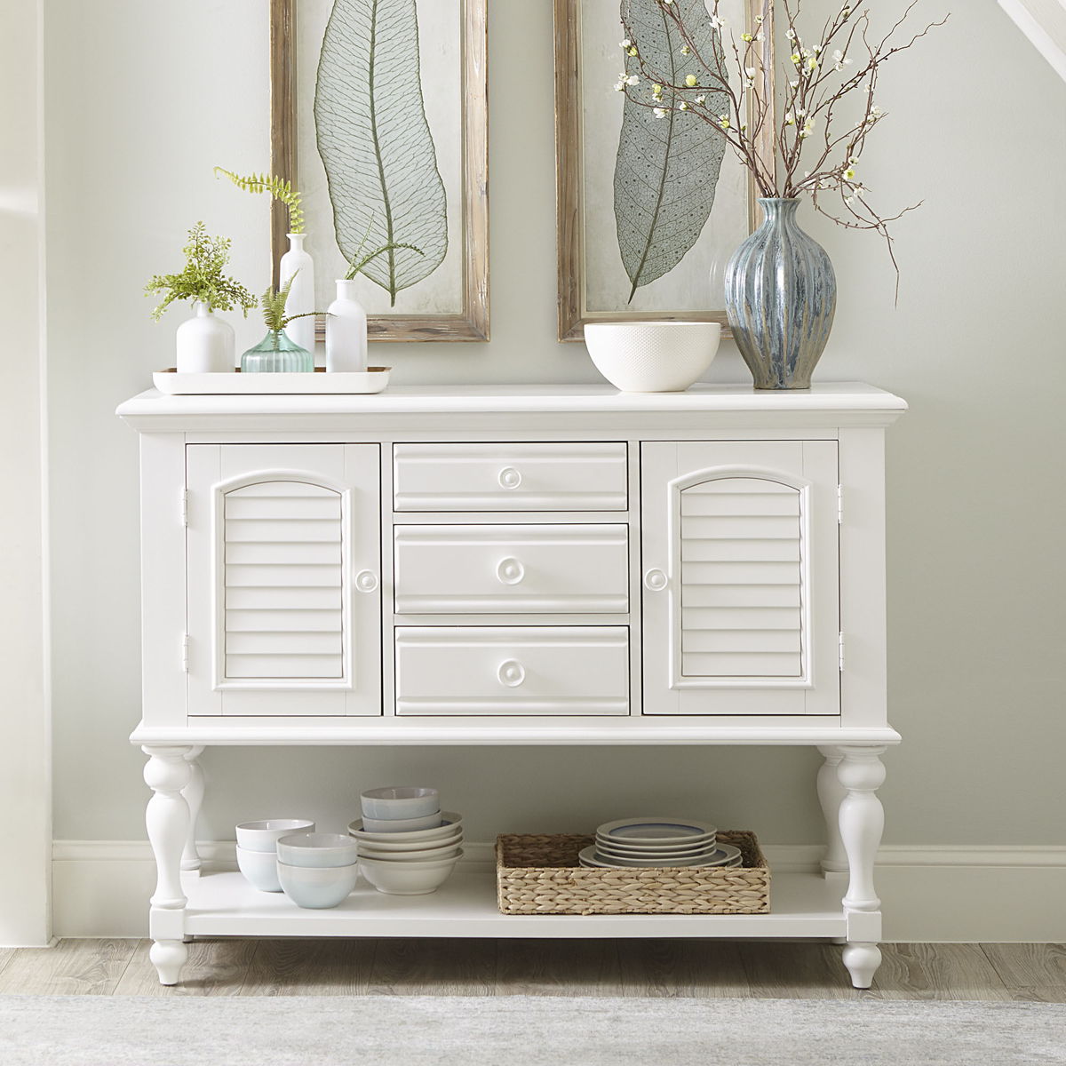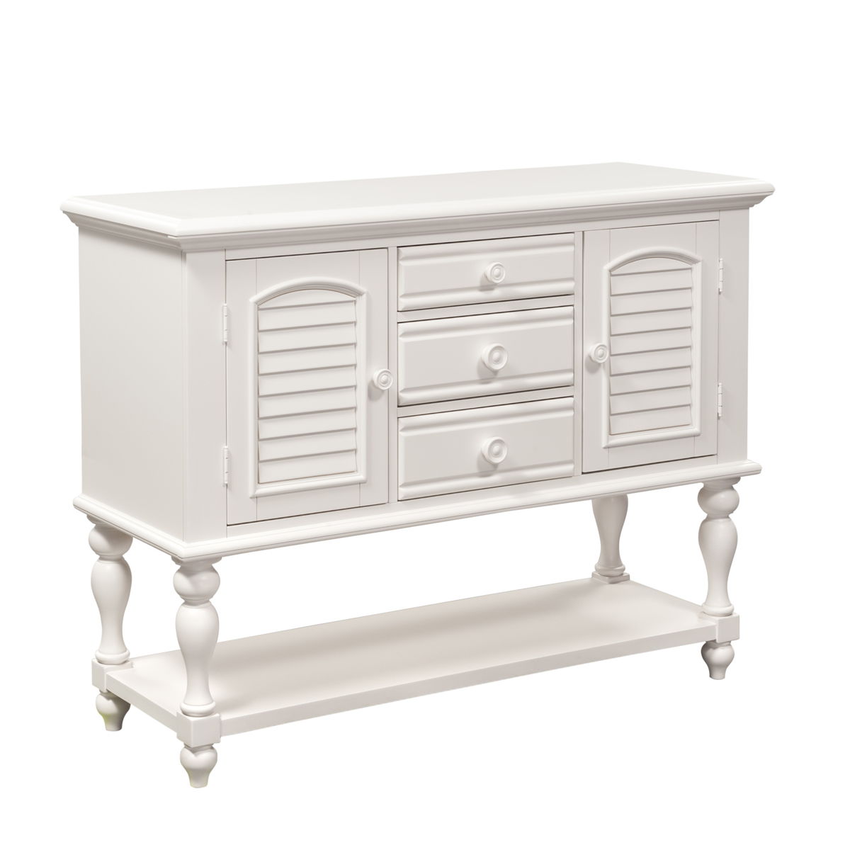 Invite cottage design into your dining room with the Summer House server. Crafted of poplar and rubberwood solids, this piece features a dove grey finish, full extension drawer glides for easy access to storage, fancy louvered panel accents on the two doors, bead molding framing on the drawers and doors, one adjustable shelf behind each door for user customization, three drawers, a felt lined silverware tray, wooden knob hardware, and is accented by beautifully round turned legs. Users can enjoy the added storage and convenience added by the bottom shelf, perfect to display items. This piece is available in an alternate finish, sure to be great addition in any space.