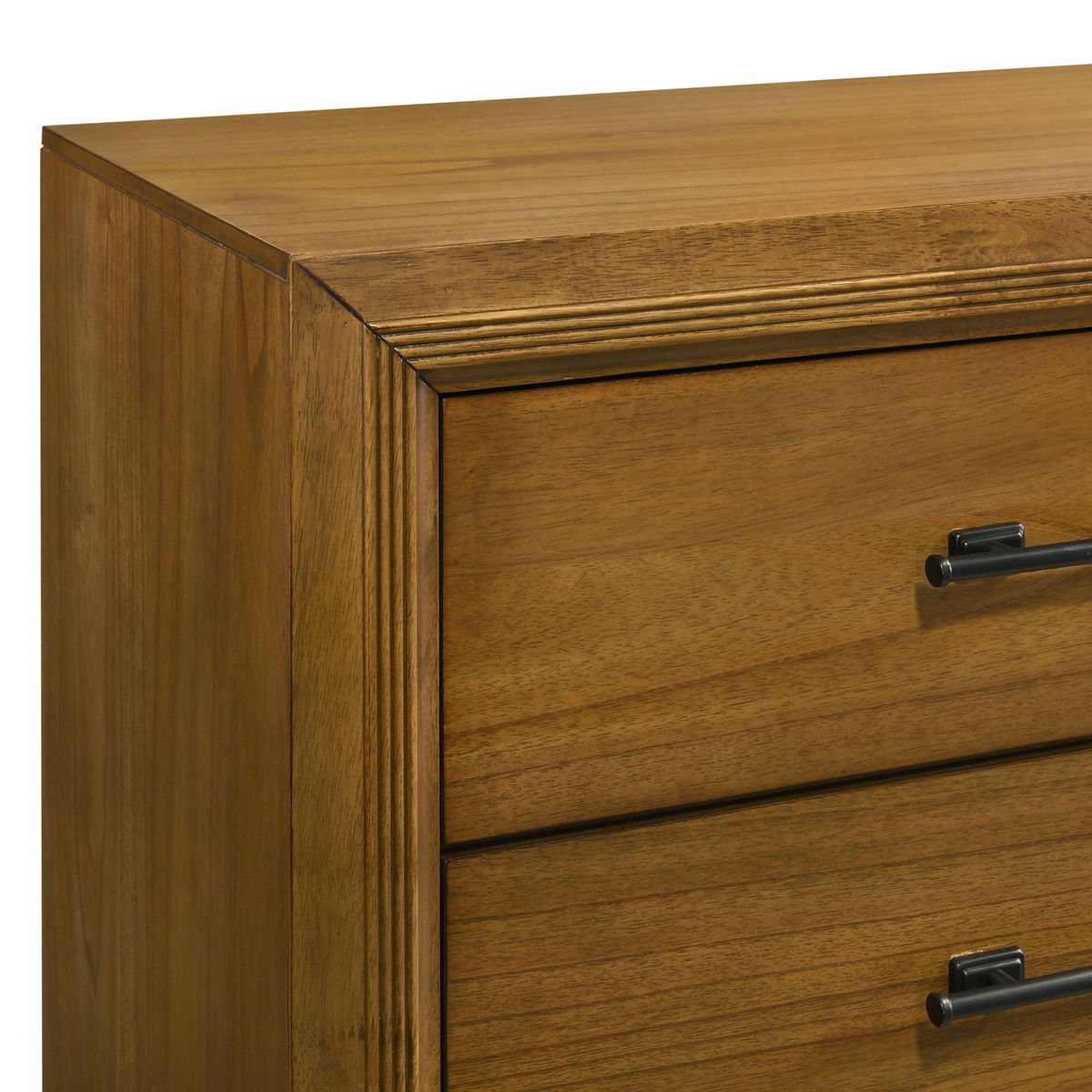 The Talcott 5 Drawer Chest in honey finish offers durability and style, crafted from solid Rubberwood, manufactured woods, and Mindy wood veneers for strength and stability. This transitional piece blends traditional and contemporary elements, featuring distinctive bracket feet, robust picture frame moldings, and sleek elongated drawer pulls. The hand-rubbed, multi-step finish highlights the wood’s natural beauty, while premium dovetail joinery and ball-bearing glides ensure smooth, full-extension drawer operation. With five spacious drawers, including velvet-lined top drawers for delicate items, this chest provides ample clothing storage and a unique, modern flair, making it a stylish and practical addition to any bedroom.