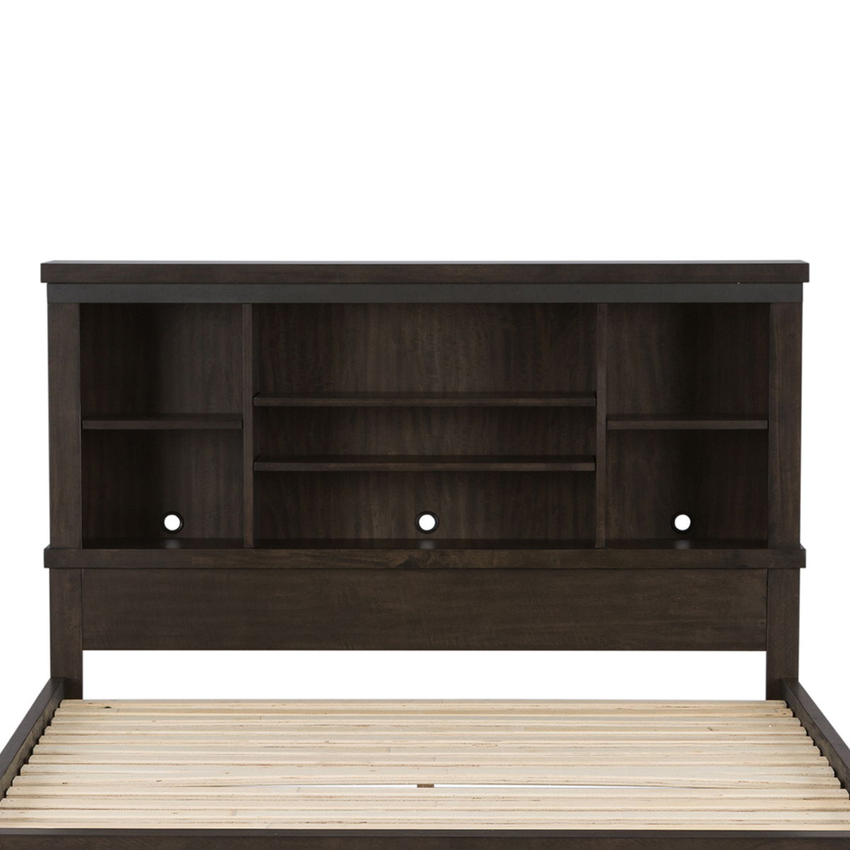 Bookcase offers storage with four adjustable shelves and wire management provisions. One design element is the hammered metal strip along the top to give you the finishing touch of industrial. Cannot stand alone. Pair with the panel or storage footboard a