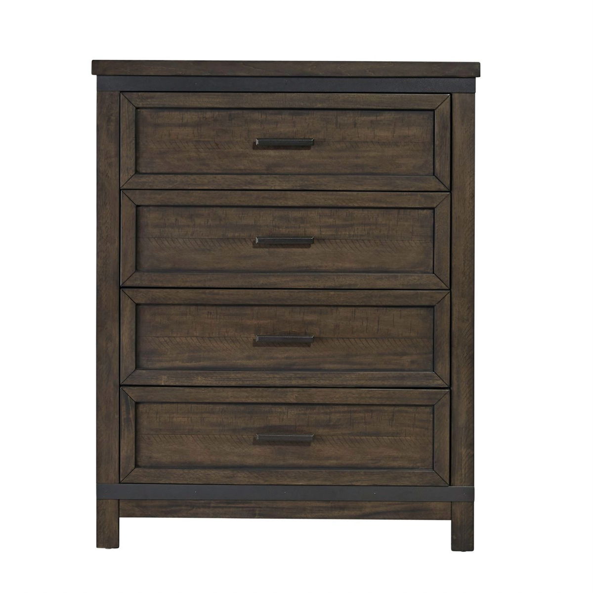 Add a natural feeling to your living space using the Thornwood Hills chest. Crafted by rubberwood solids and mango veneers, this piece features a rock beaten finish with saw cuts, wide pilasters with block feet, planked top and sides, fully stained interior drawers, felt lined top drawer, full extension drawer glides for easy access to storage, hammered metal bar pull hardware in a dark antique pewter, framed drawer fronts, bottom case dust proofing to protect contents, hand hammered metal strip accents, and heavy distressing.