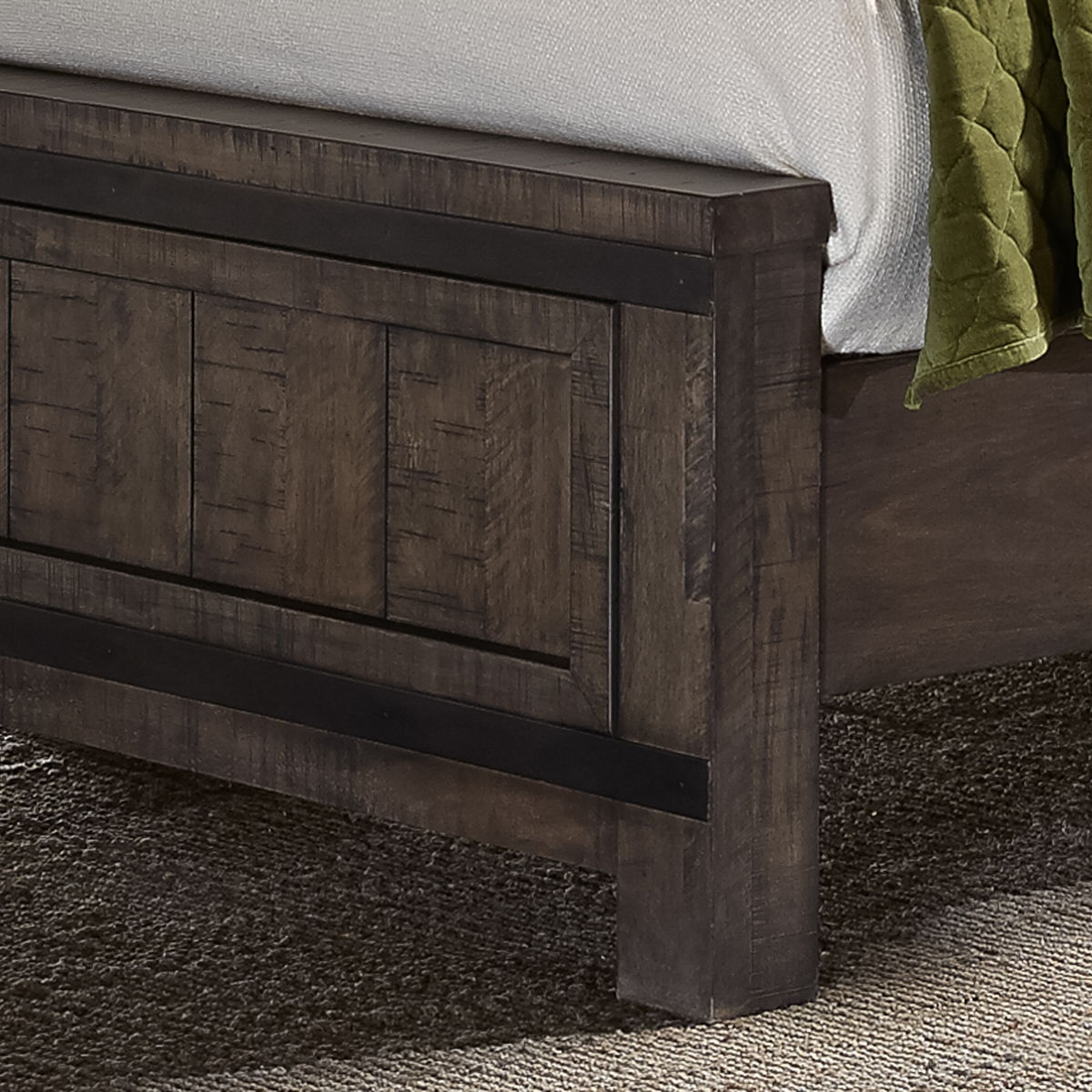 Add a natural feeling to your living space using the Thornwood Hills panel bed. Crafted with rubberwood solids and mango veneers, the rock beaten gray finish is highlighted by saw cuts and hammered metal strip accents across the planked headboard and footboard. Never question the reliability of the bed due to the bolt-on rails and center supported slat system.