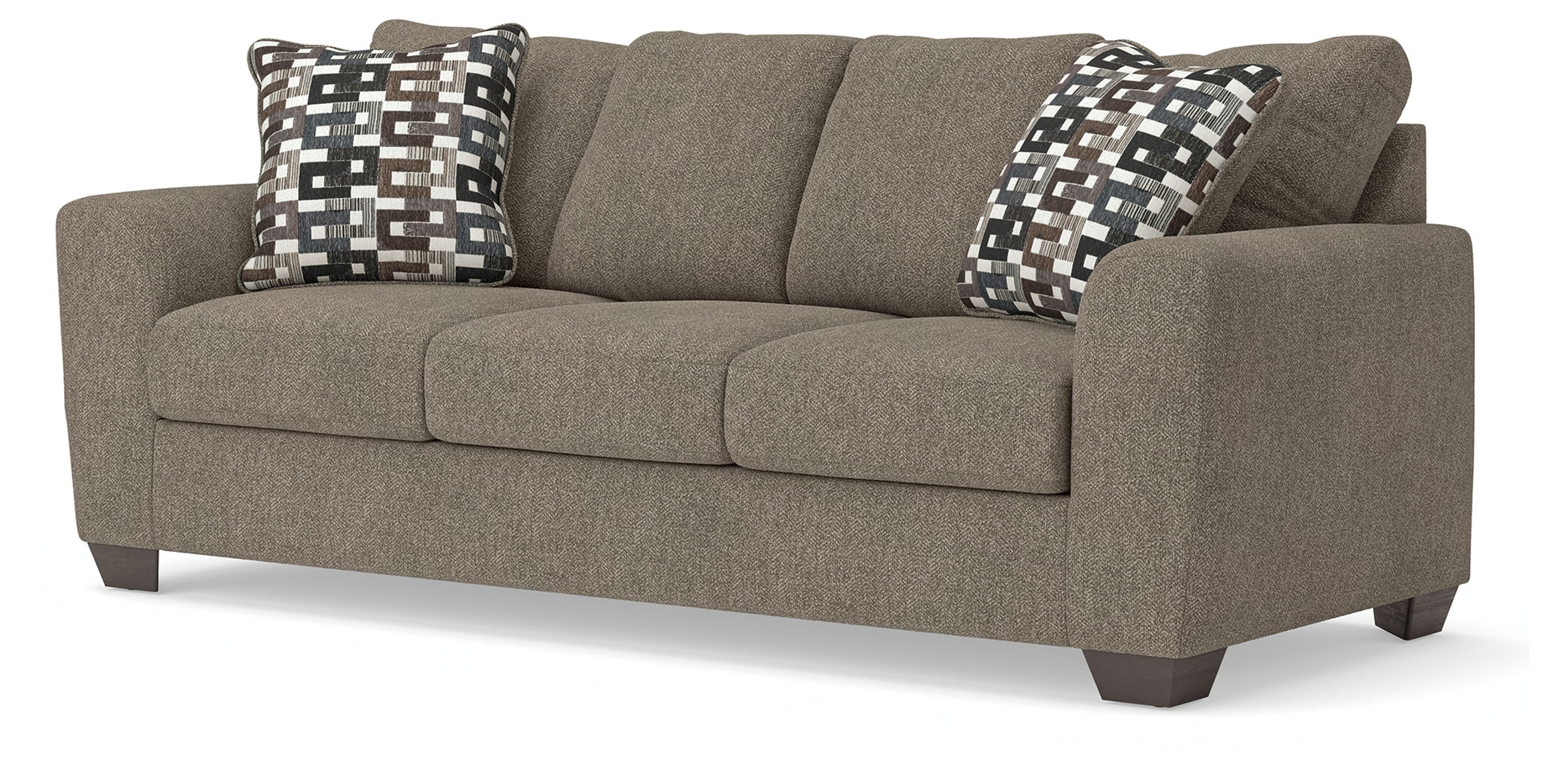 Transitional and right on trend. This queen sleeper sofa’s upholstery is a delightful change from the ordinary, with hints of soft brown giving the gray hue added depth. A built-in memory foam mattress easily pulls out to accommodate overnight visitors. It’s punctuated with chic accent pillows in an eye-catching, stylized stripe design. Whether you’re hosting friends and family or relaxing solo, this sleeper sofa invites homey, comfortable character into your space.