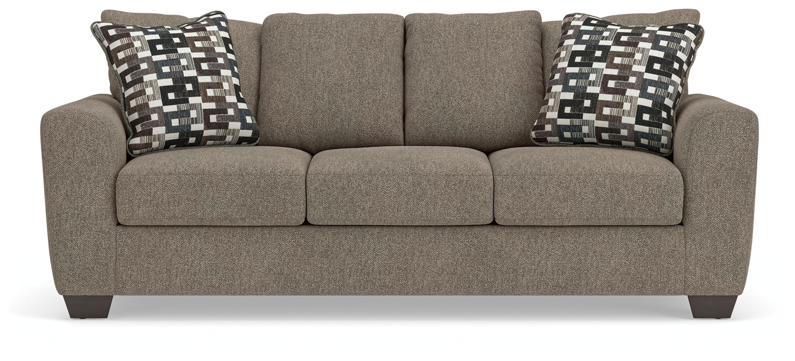 Transitional and right on trend. This sofa’s upholstery is a delightful change from the ordinary, with hints of soft brown giving the gray hue added depth. It’s punctuated with chic accent pillows in an eye-catching, stylized stripe design. Whether you’re hosting friends and family or relaxing solo, this sofa invites homey, comfortable character into your space.
