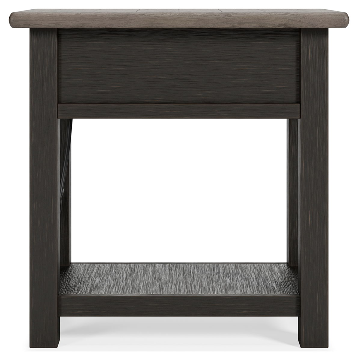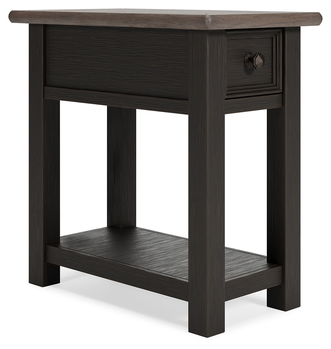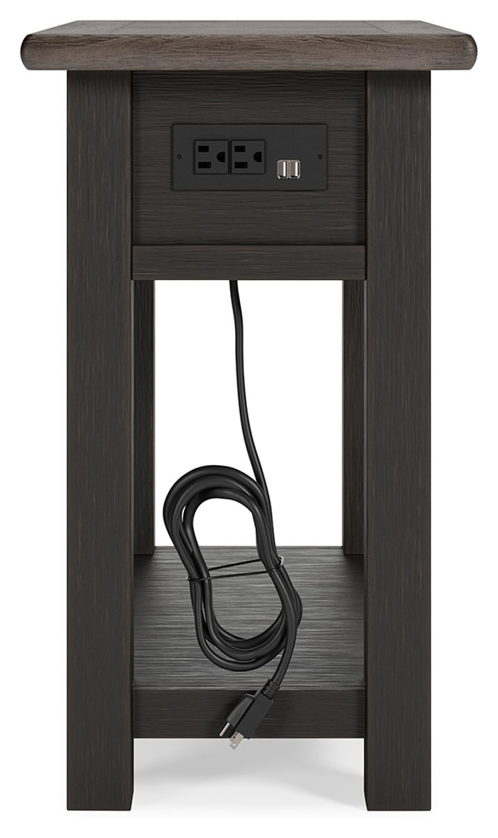 Quality crafted and richly styled, this rectangular chairside end table is sure to charm. Its two-tone aesthetic pairs a weathered grayish brown tabletop with a textured wire brushed base in black. A built-in shelf offers handy display space. And the table’s integrated 110V power supply and dual USB charging ports make it so easy to keep your personal devices powered up.