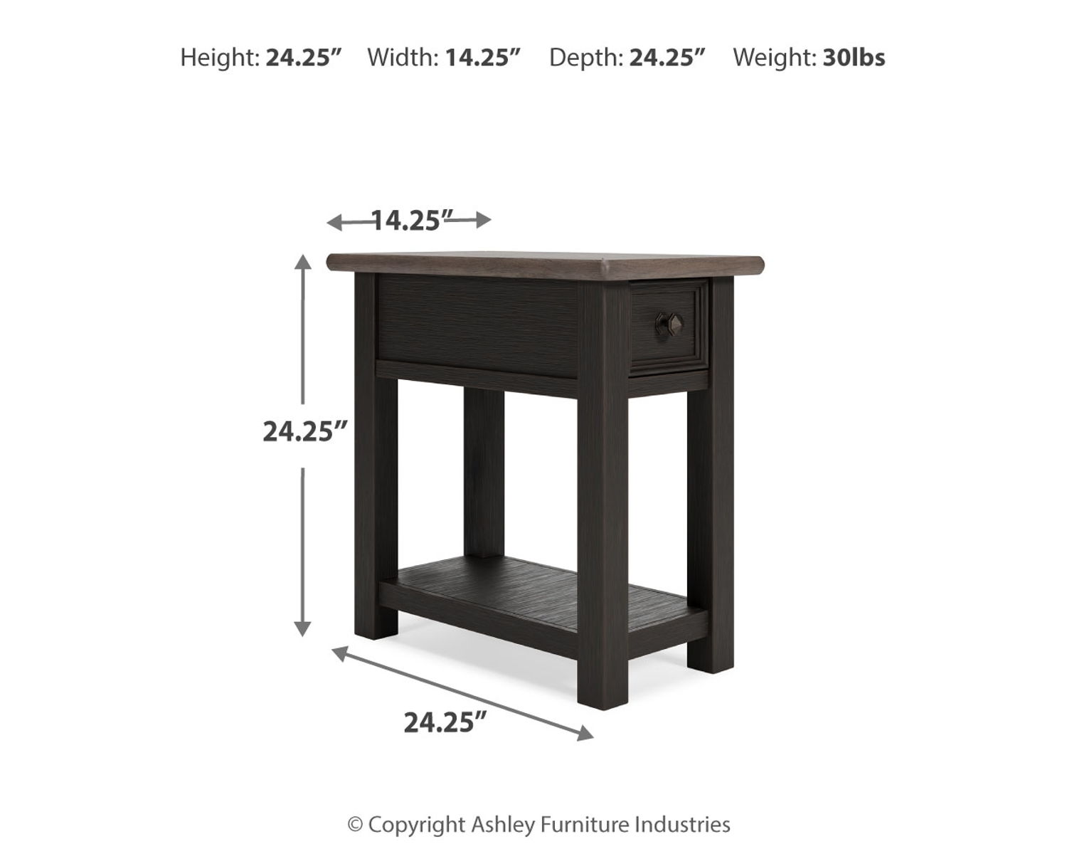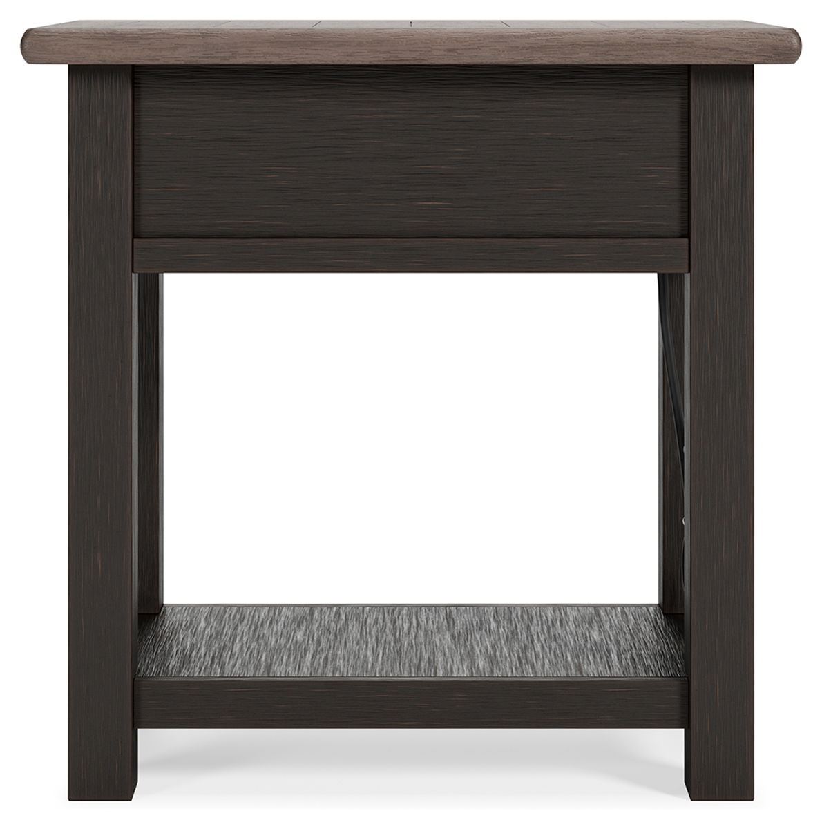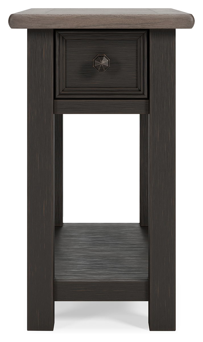Quality crafted and richly styled, this rectangular chairside end table is sure to charm. Its two-tone aesthetic pairs a weathered grayish brown tabletop with a textured wire brushed base in black. A built-in shelf offers handy display space. And the table’s integrated 110V power supply and dual USB charging ports make it so easy to keep your personal devices powered up.