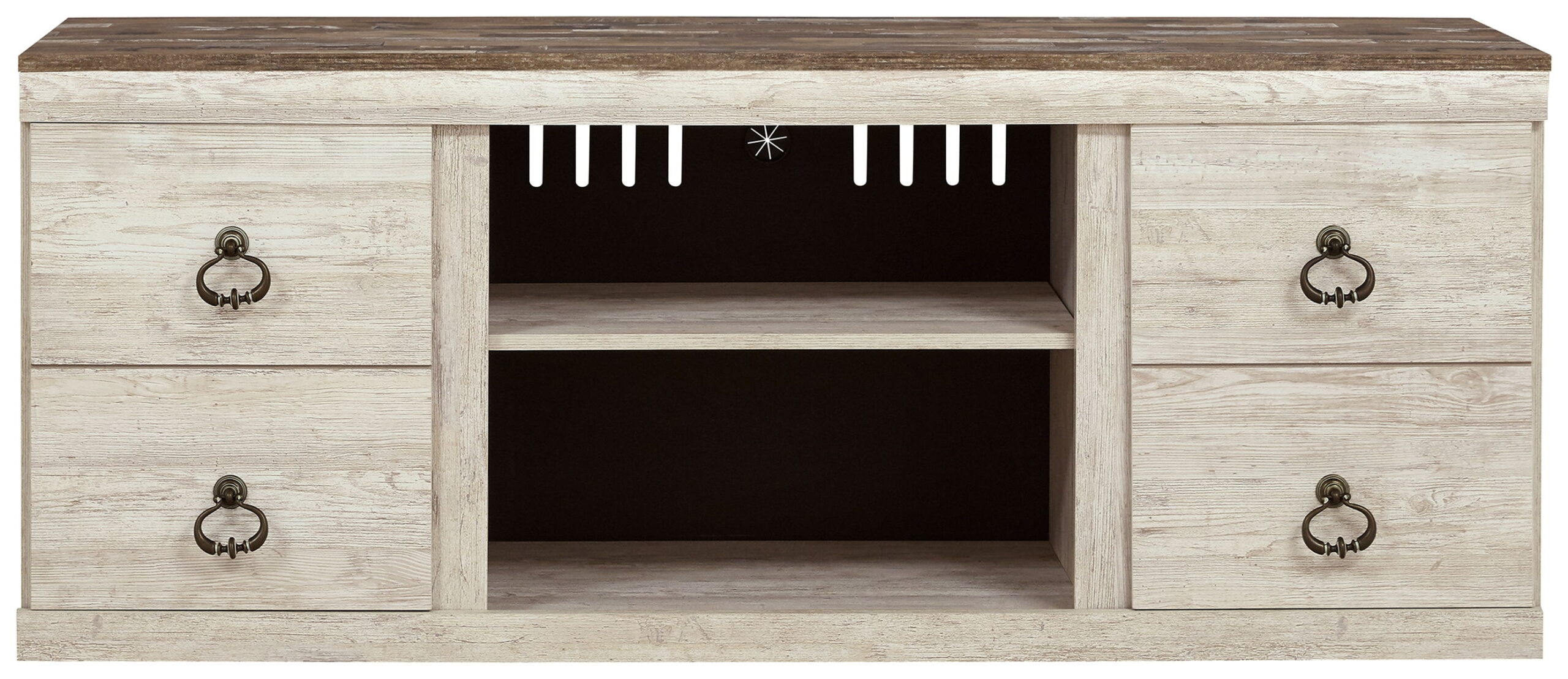 This TV stand with fireplace option is the ultimate statement piece for a coastal cottage or shabby chic inspired retreat. Its whitewash finish is wonderfully easy on the eyes. Paired with the TV stand’s unique plank-style top, it’s a driftwoody look that has our minds drifting away to beachy-keen escapes. Enhance the sense of homey warmth by removing the center shelf and making room for the electric fireplace insert, sold separately.