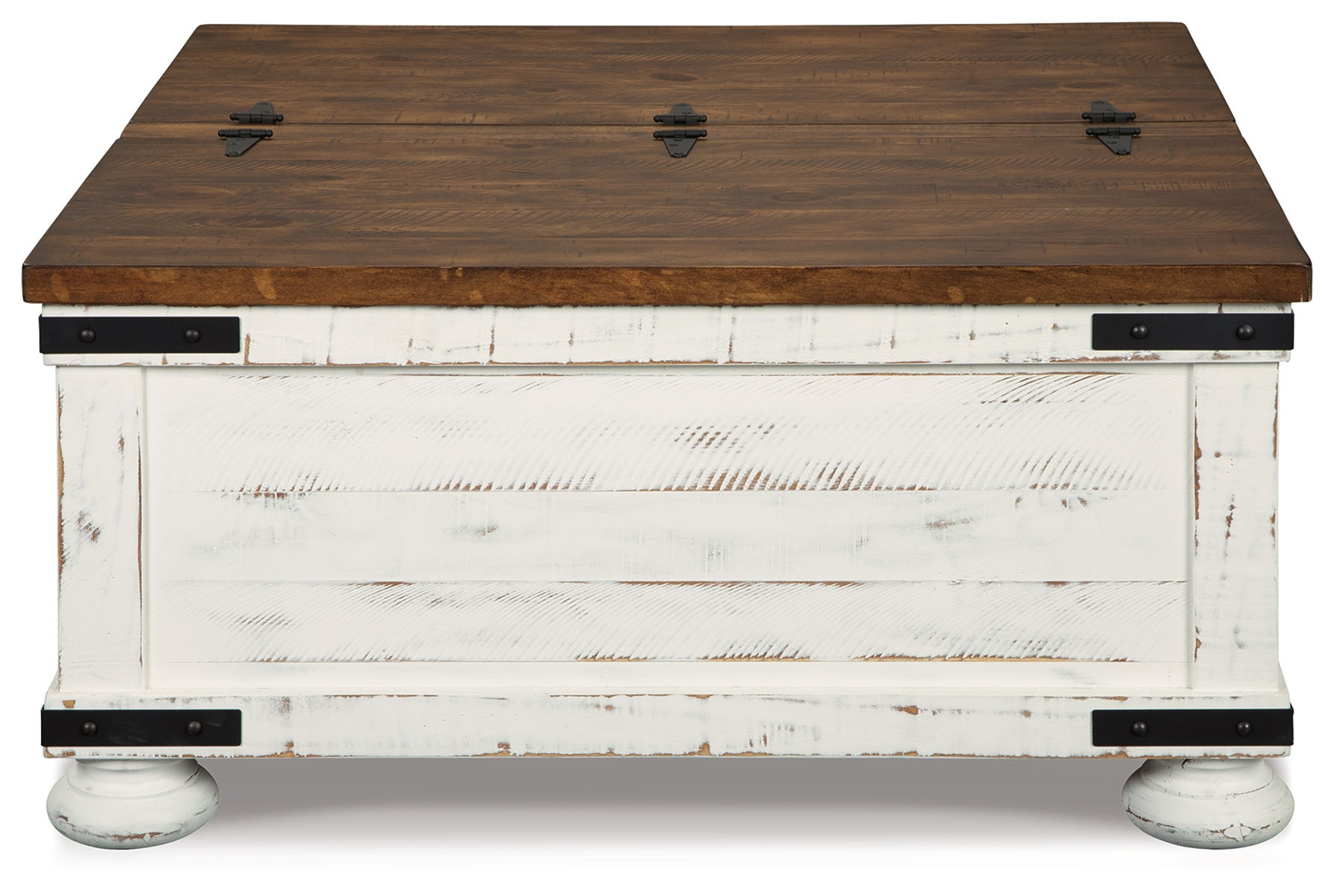 Double take. Sporting a two-tone finish, dual-sided lid design and expansive storage space, this square coffee table takes the art of rustic farmhouse living to a new level. Designer touches include plank-effect styling, heavy distressing and industrial bracket hardware.