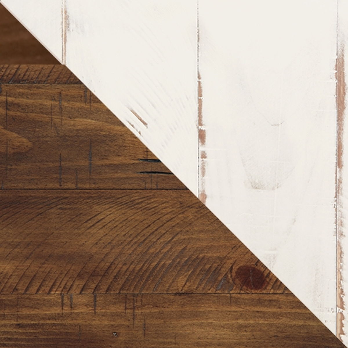 Double take. Sporting a two-tone finish that pairs a distressed vintage white with aged natural pine color, this end table elevates the art of rustic farmhouse living. Enhancing its charm: shelved storage visible through cabinet doors with inset metal grills.
