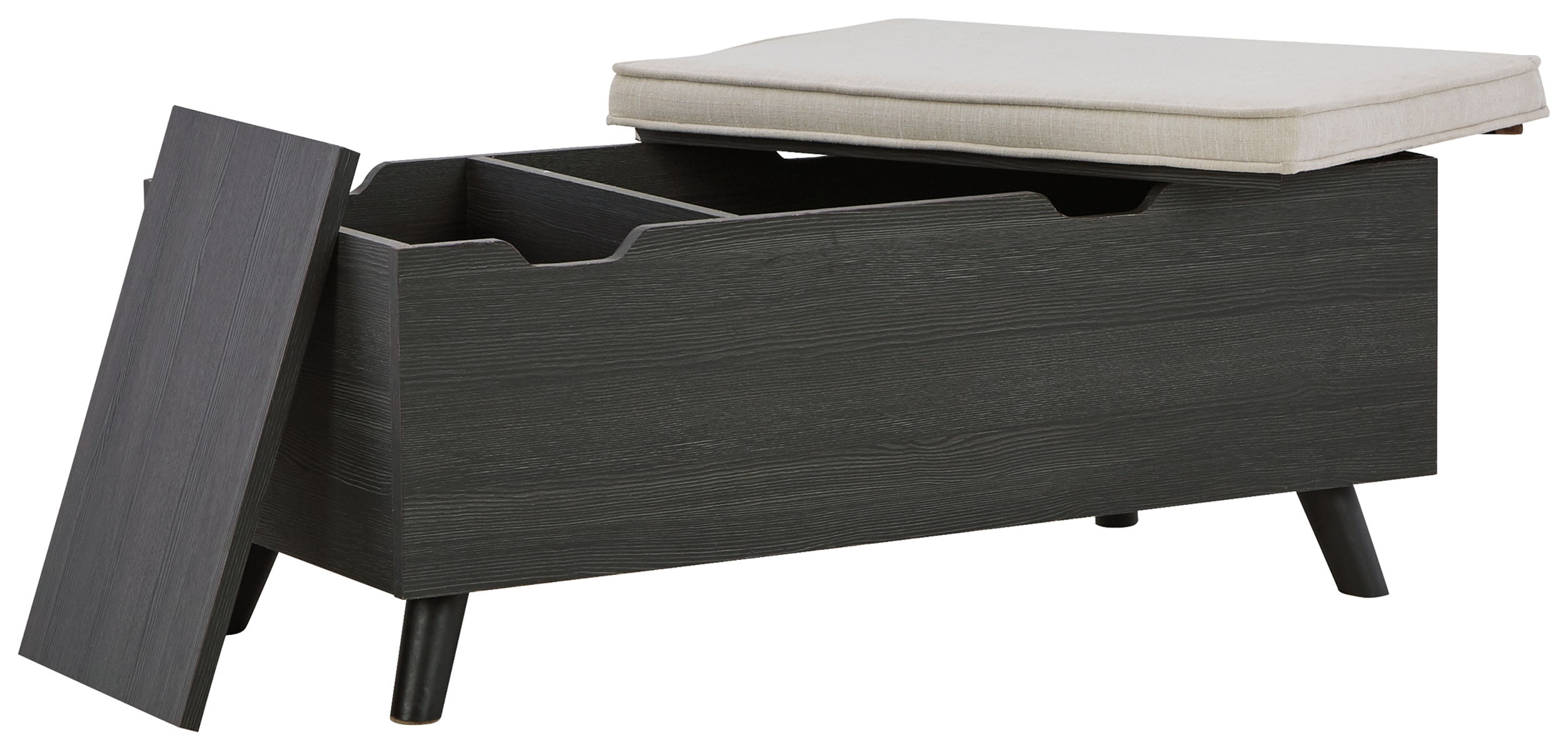 The clean profile of this small storage bench makes an entrance anywhere and everywhere you place it. A replicated blackened wood finish and tapered wood legs lend a fresh flair. Adding form and function, both tops are removable to expose hidden storage underneath. It’s a must-have piece for small spaces.